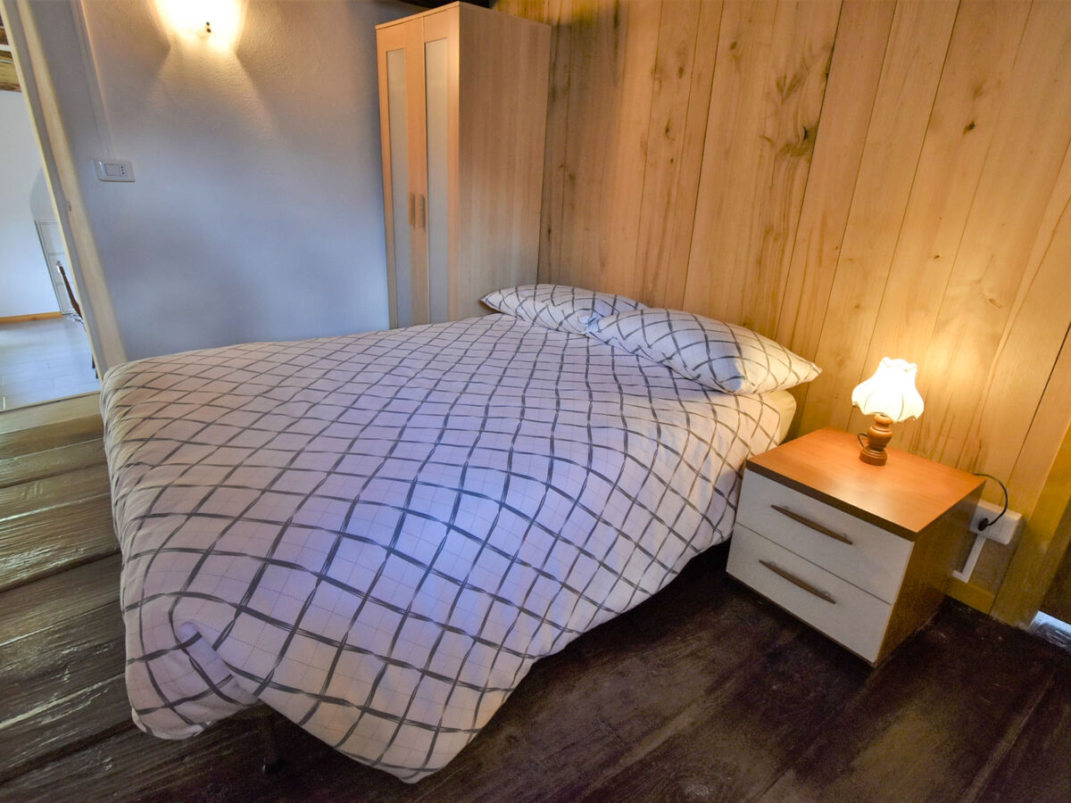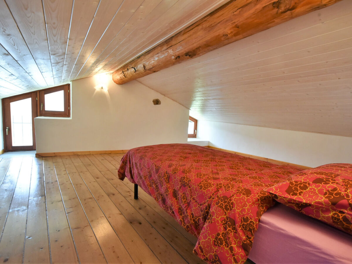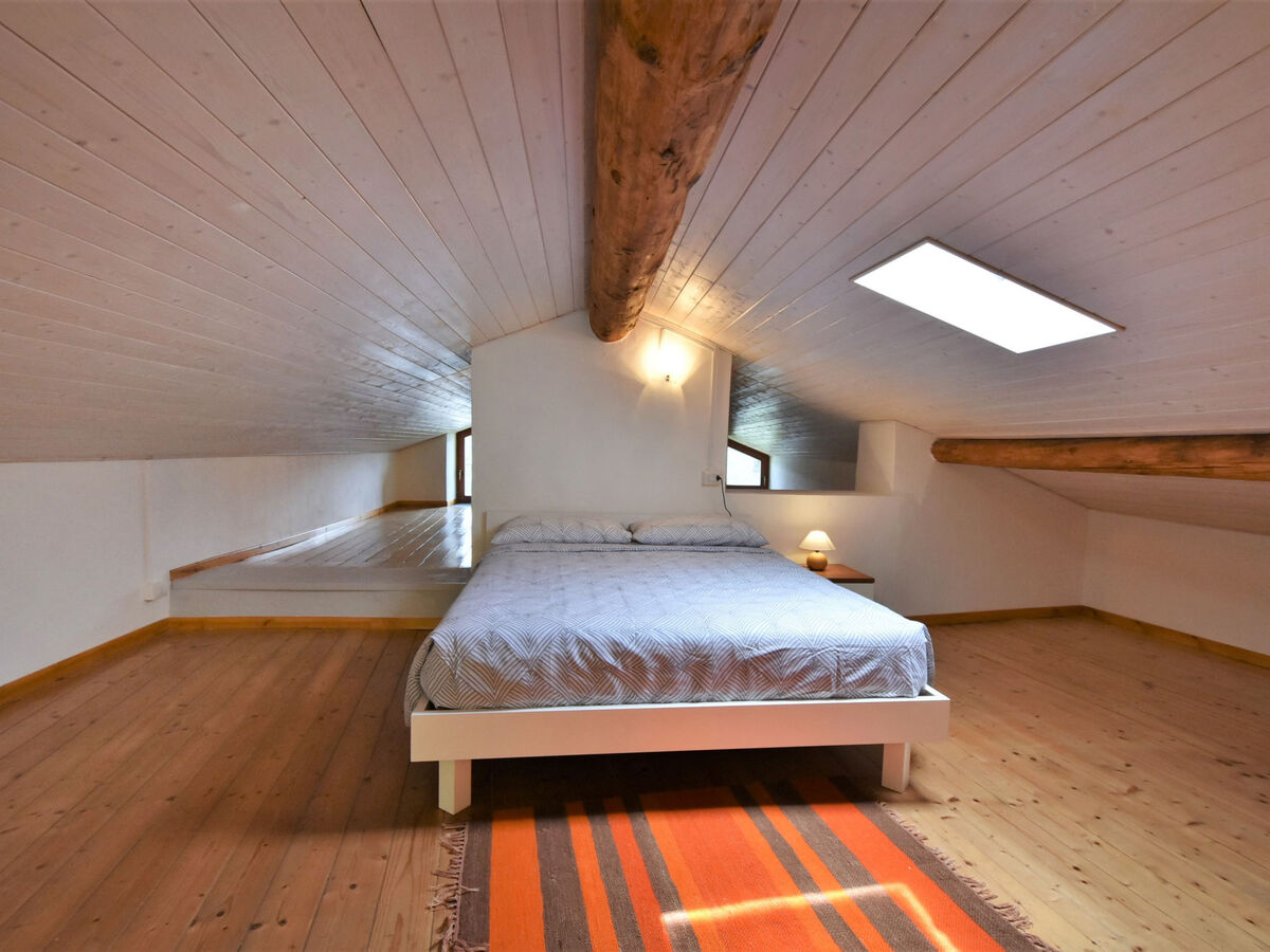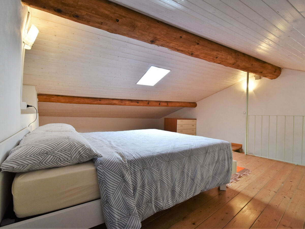 À l'étage supérieur: 1 grande chambre, mansardée, ouverte hauteur plafond 73 - 166 cm avec 1 lit.