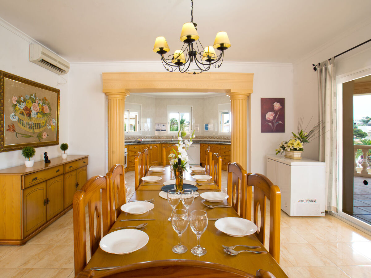 Séjour/salle à manger avec table pour les repas, TV (satellite), chaînes de TV internationales, air-conditionné et chauffage à air chaud.