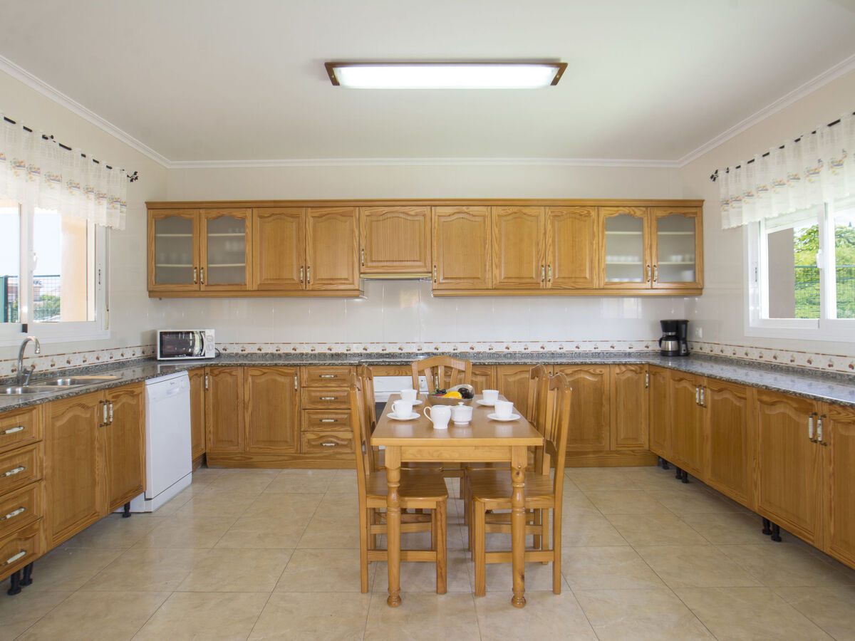 Cuisine ouverte (four, lave-vaisselle, 4 plaques vitrocéramiques, grille-pain, bouilloire électrique, micro-ondes, congélateur, cafetière électrique) avec table pour les repas.