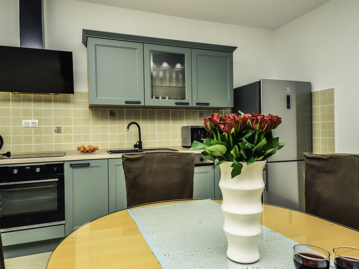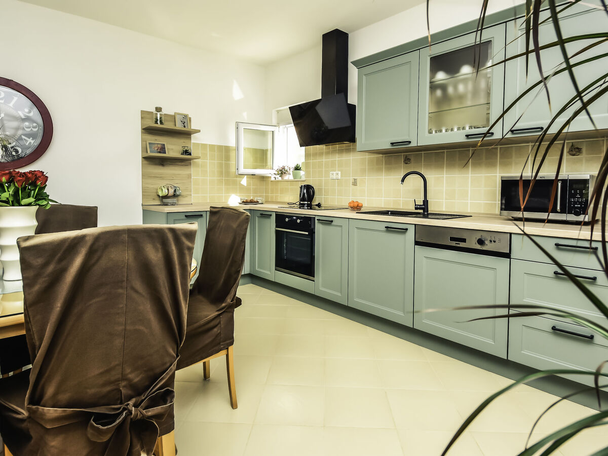 Cuisine ouverte (four, lave-vaisselle, 4 plaques vitrocéramiques, micro-ondes, congélateur, cafetière électrique).