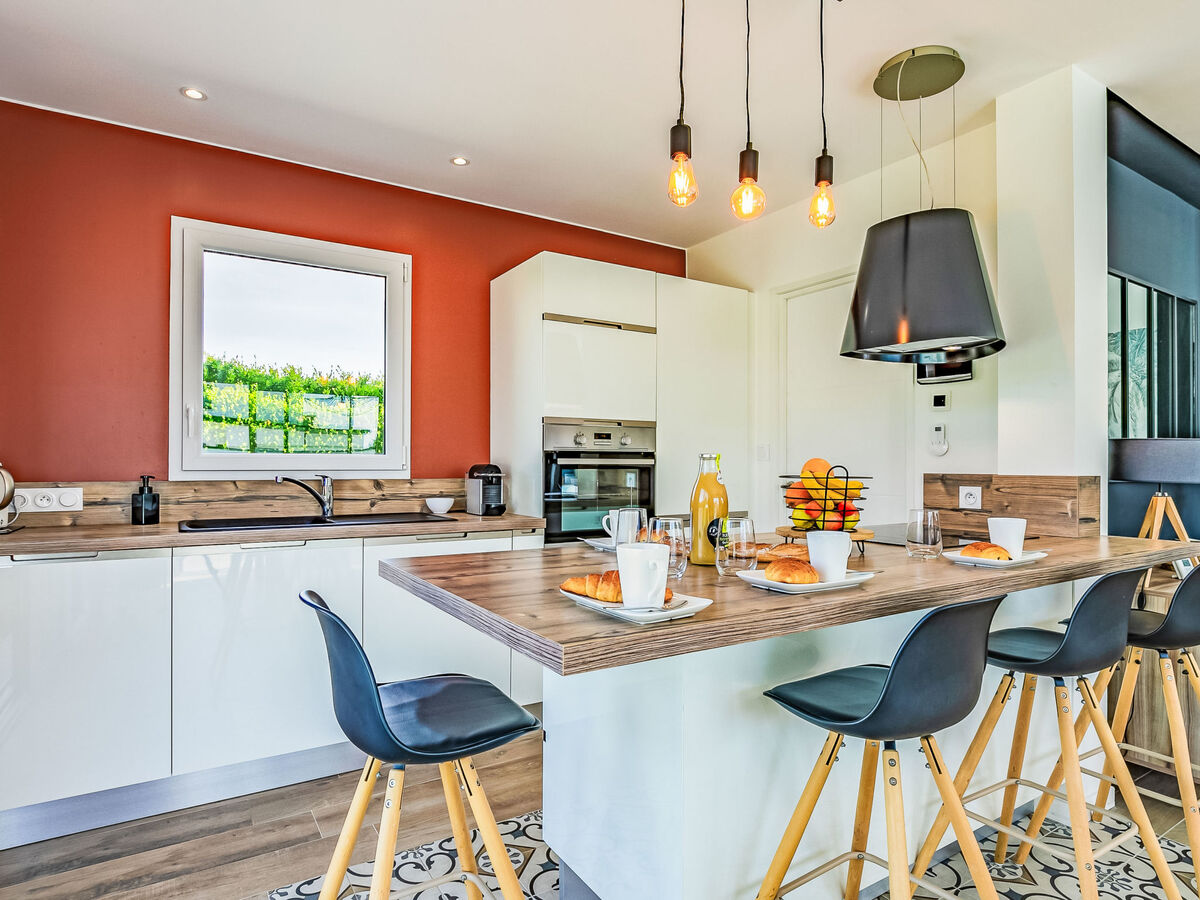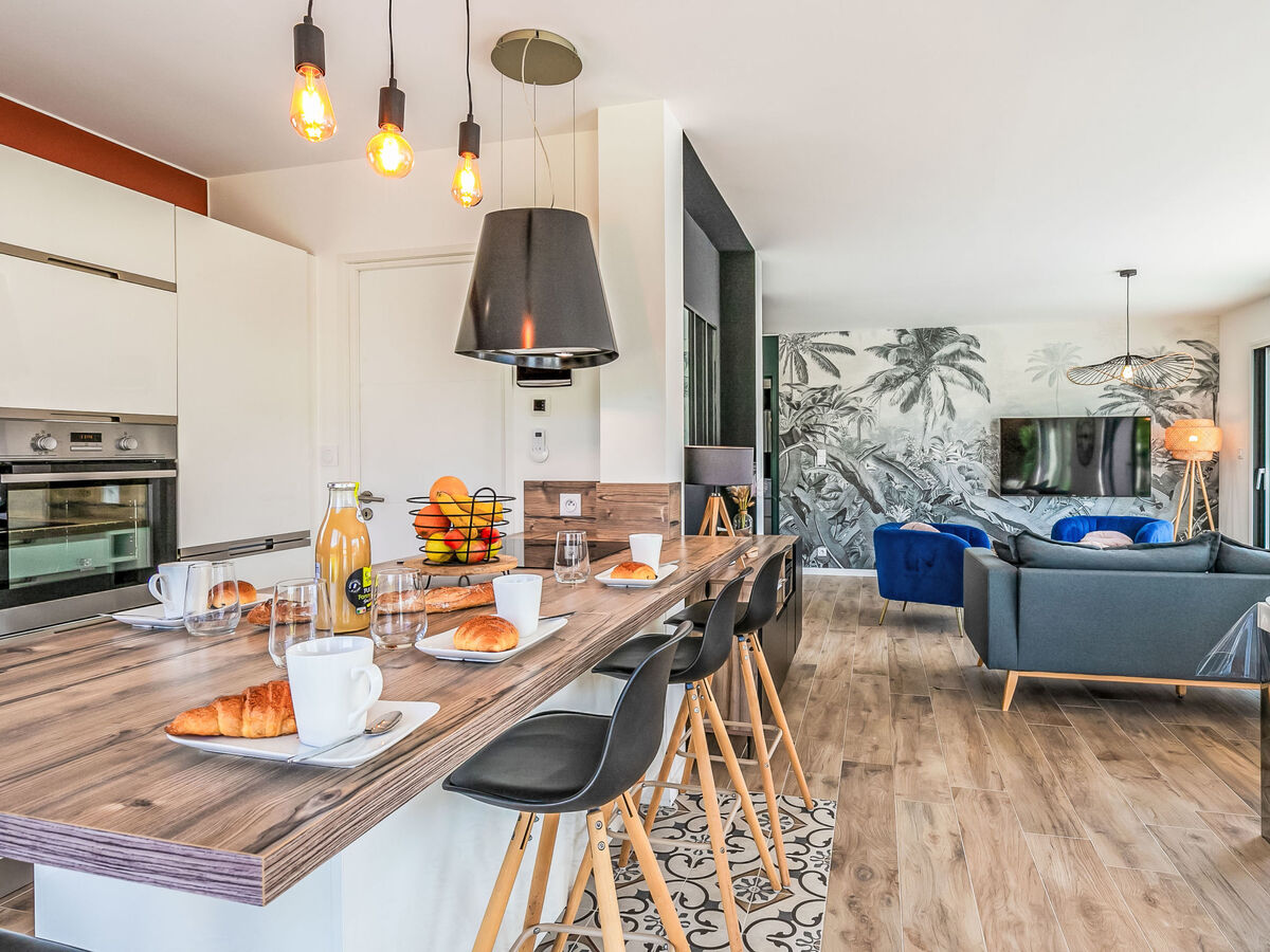 Cuisine ouverte (four, lave-vaisselle, 3 plaques à induction, grille-pain, bouilloire électrique, micro-ondes, congélateur, cafetière électrique, ilot de cuisine) avec coin repas.