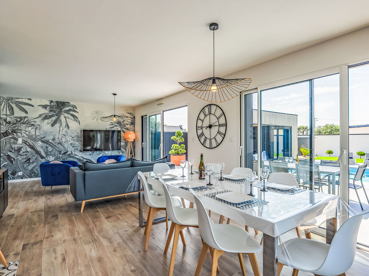 Clair, aménagement confortable et moderne: grand séjour/salle à manger avec table pour les repas, Télévision numérique et écran plat.