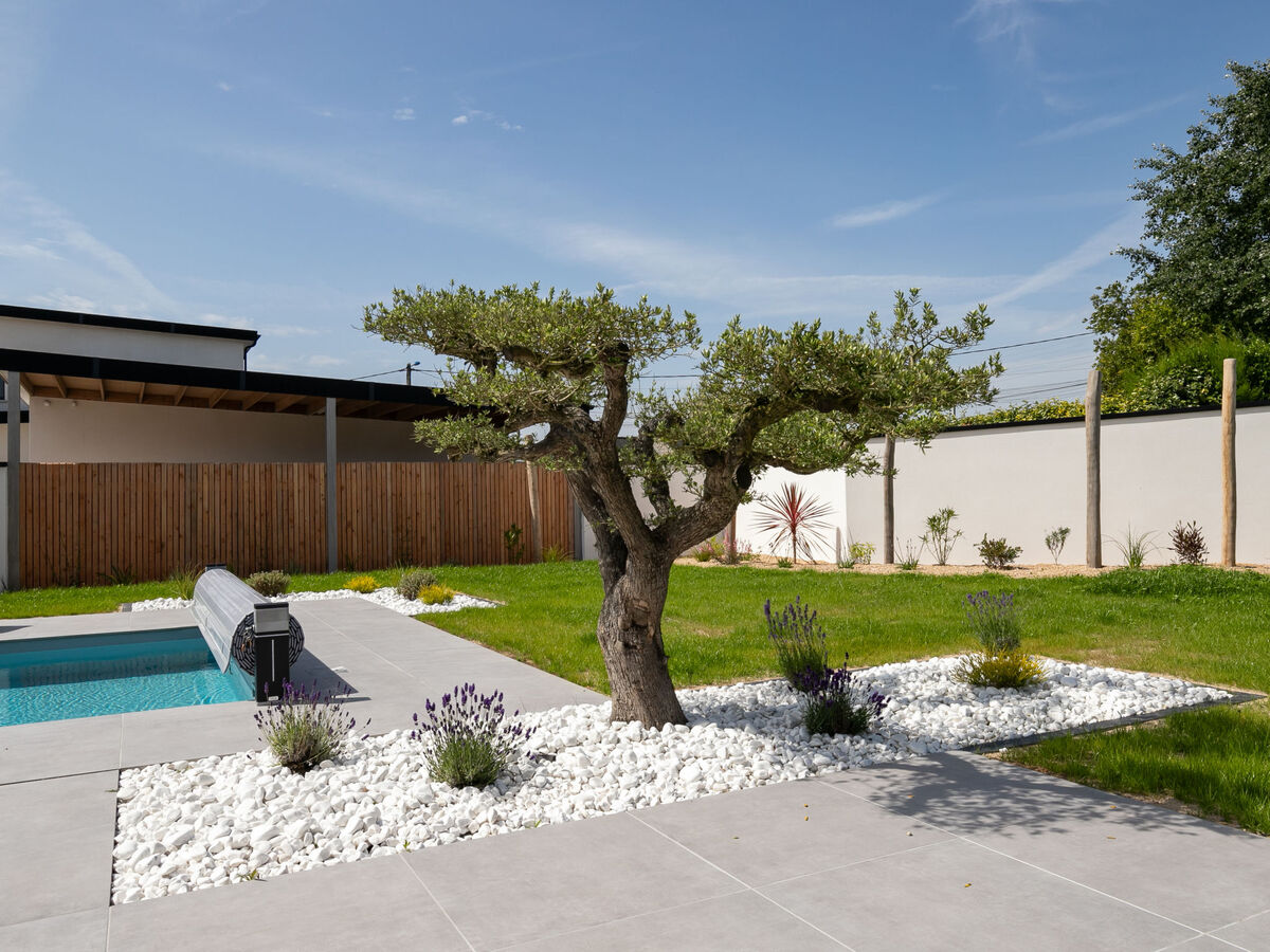 A usage privé: terrain 1'300 m2, jardin avec pelouse et plantes, piscine rectangulaire, chauffée (4 x 8 m, 32 m2, profondeur 150 cm, disponibilité saisonnière: 01.Mai.