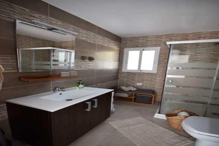 Rez-de-chaussée: (Salle de séjour(TV(satellite), table, coin salon, chauffage, climatisation), cuisine(grille-pain, plaque de cuisson, cafetière/percolateur, four, micro ondes, lave-vaisselle , réfrigérateur, congélateur, Presse-agrumes), chambre(lit double), chambre(lit double), salle de bains(douche, lavabo, WC)) terrasse(privé), mobilier de jardin(4 personnes), transats, parking, piscine(privé)