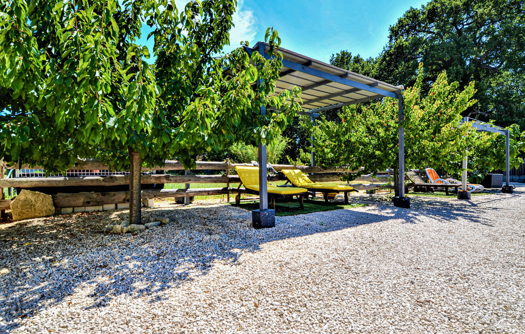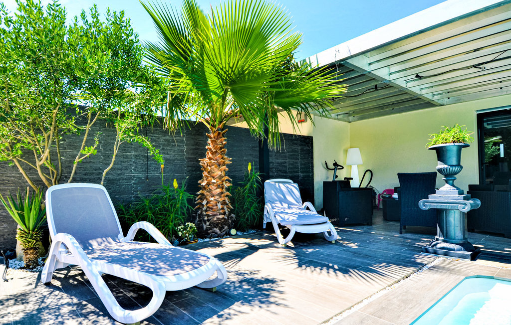 Bien-être à l'extérieur : Location de vacances disposant de chaises-longues et d'un ou plusieurs équipements tels que piscine extérieure, jacuzzi extérieur, lit à baldaquin de jardin etc...