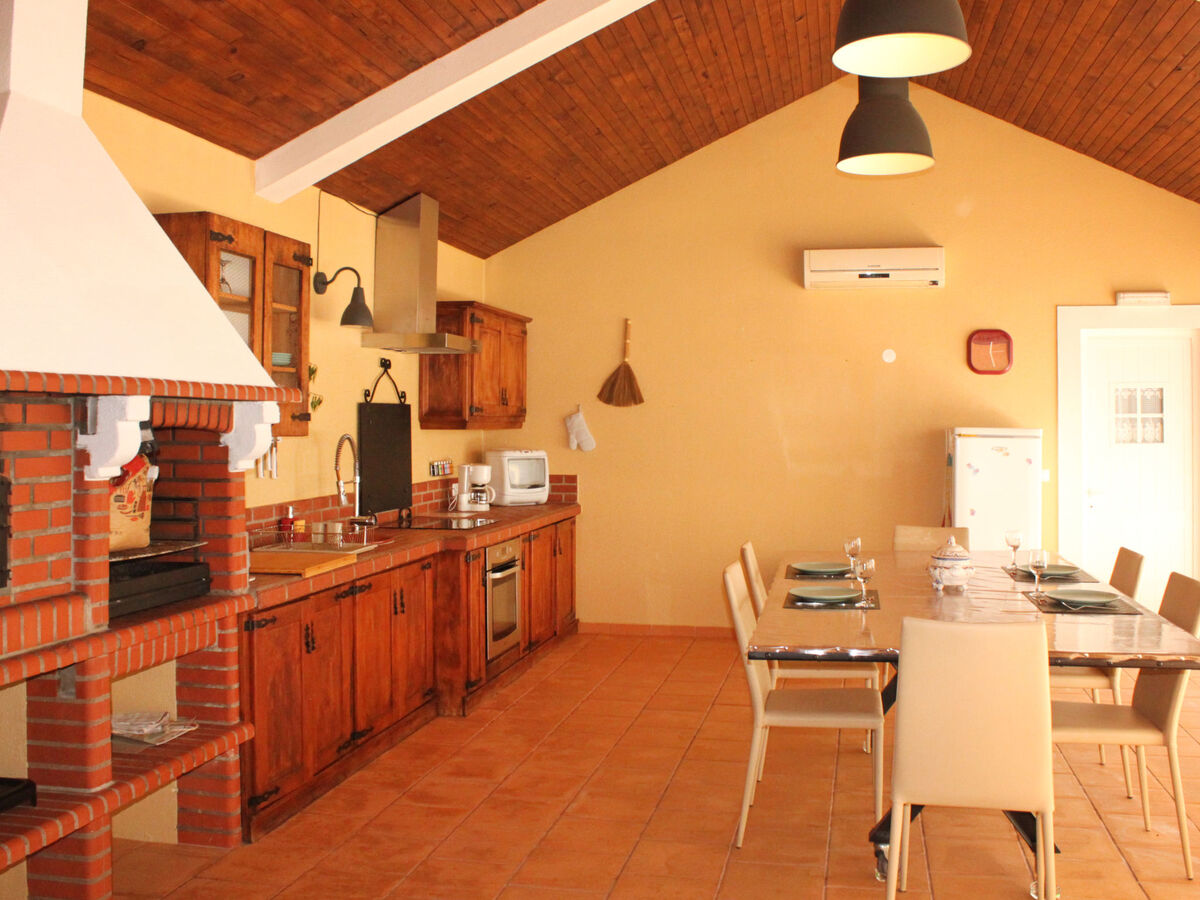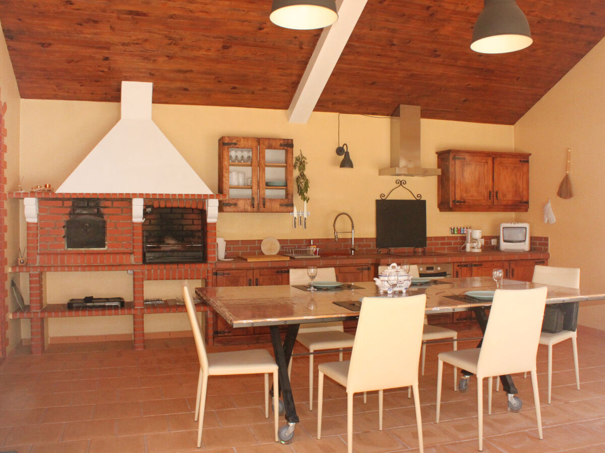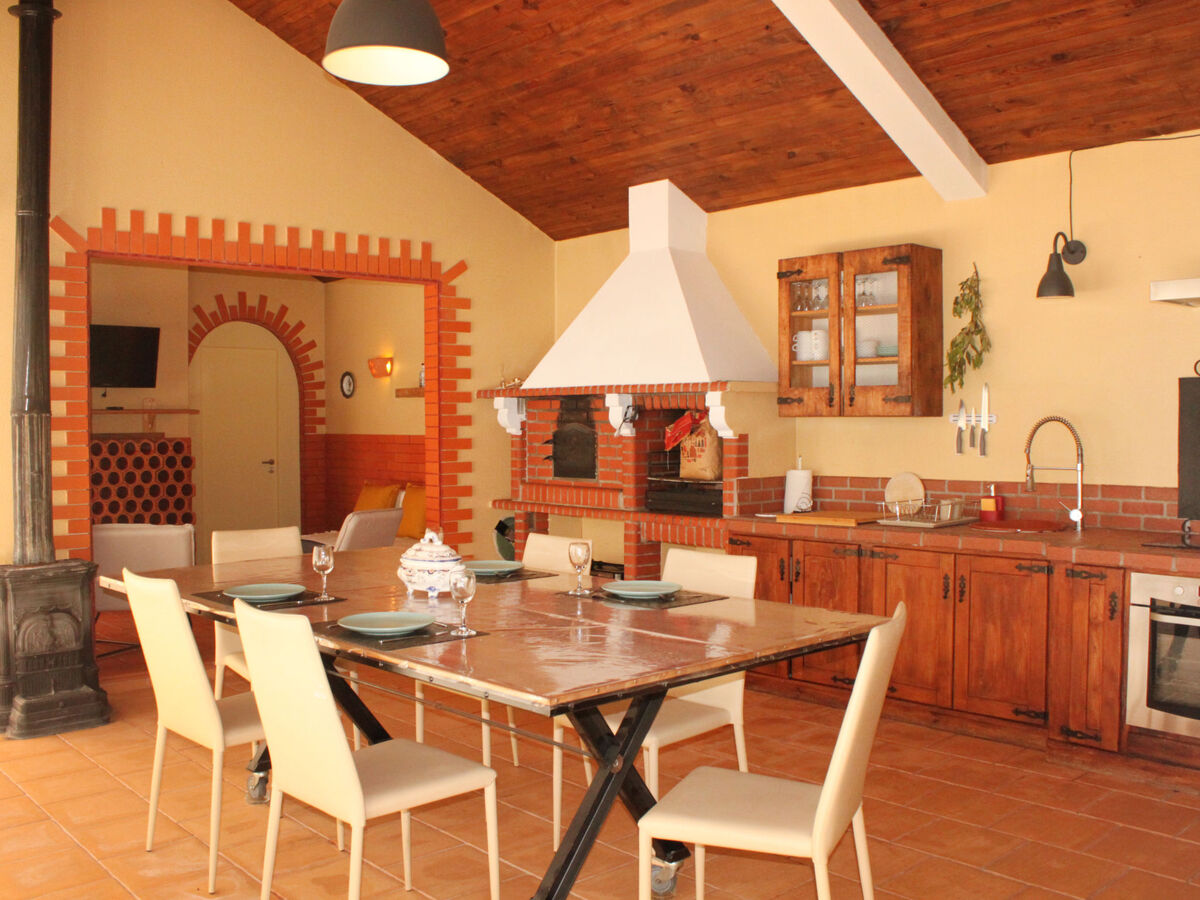 Cuisine/séjour (four, lave-vaisselle, 4 plaques vitrocéramiques, grille-pain, bouilloire électrique, micro-ondes, congélateur, cafetière électrique, four à pizza) avec poêle suédois, table pour les repas, TV (satellite) et air-conditionné.
