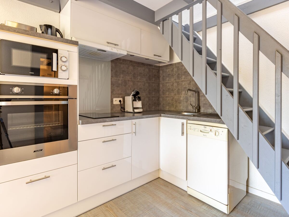 Cuisine ouverte (lave-vaisselle, 2 plaques vitrocéramiques, grille-pain, bouilloire électrique, micro-ondes, cafetière électrique).