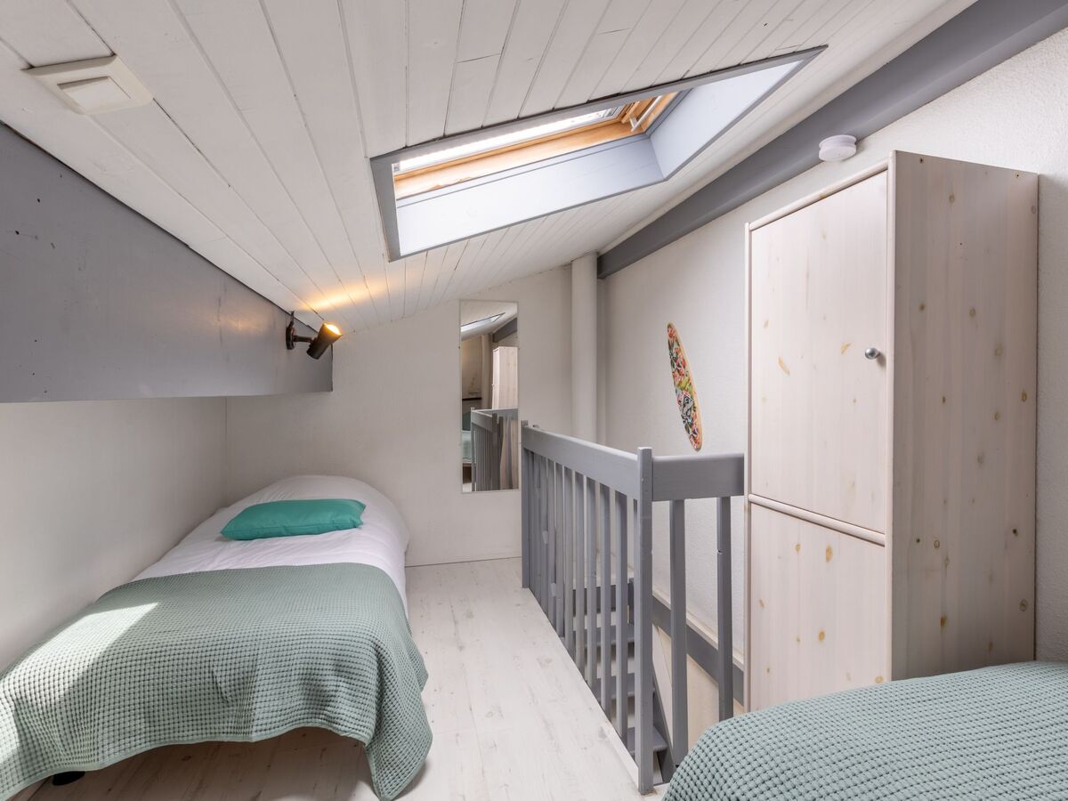 À l'étage supérieur: (escalier raide) galerie mansardée, ouverte avec 2 lits (80 cm, longueur 190 cm).