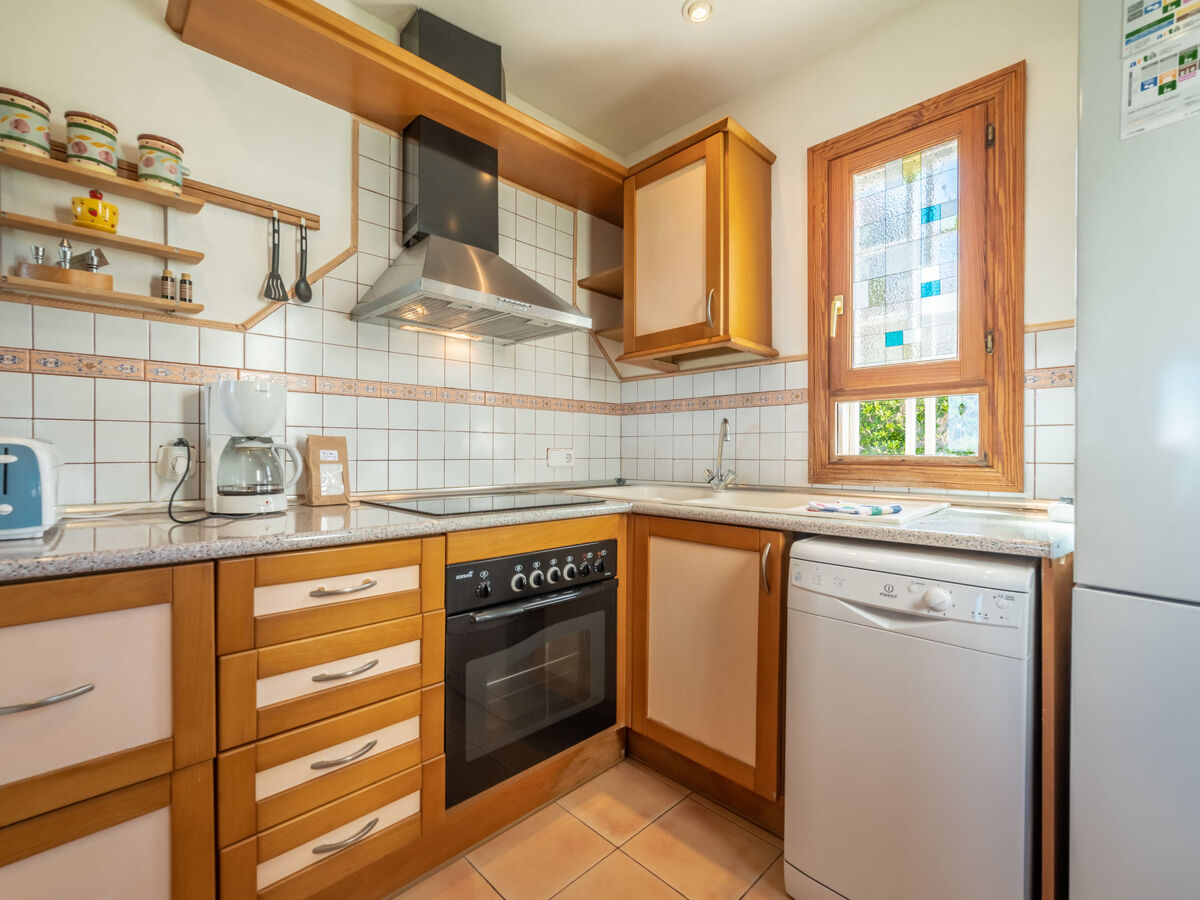 Cuisine ouverte (four, lave-vaisselle, 3 plaques vitrocéramiques, grille-pain, bouilloire électrique, micro-ondes, congélateur, cafetière électrique) avec bar.