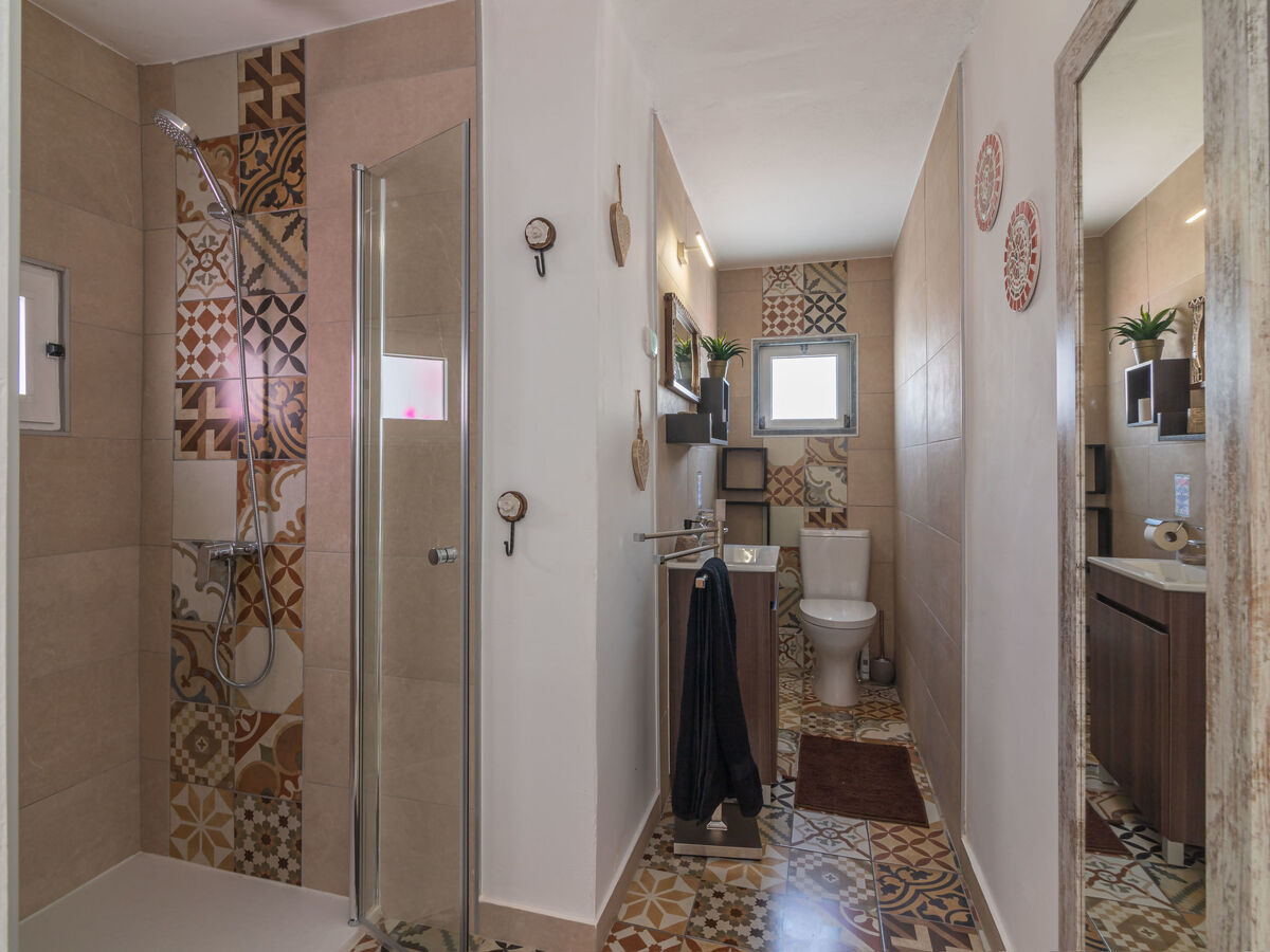 À l'étage supérieur: 1 chambre avec 1 grand-lit (140 cm, longueur 190 cm), douche/WC, air-conditionné et chauffage à air chaud.