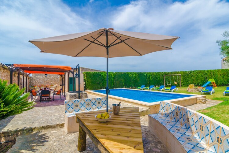Disfrute de un verano mallorquÃn en esta auténtica finca del siglo XIX. En la piscina privada de cloro, con un tamaño de 5m x 10m y una profundidad entre 1.35m y 2.1m puede refrescarse cuando quiera. Aparte, hay una ducha exterior para quitarse el cloro de la piel después de nadar. La piscina está rodeada por un jardÃn con ocho tumbonas y una bonita terraza con toldo para protegerse del sol. Los niños encuentran una zona de juegos para que no haya aburrimiento. Una barbacoa fija va a encantar a todos los chefs que pueden sorprender a sus seres queridos con ricas carnes y verduras de la parrilla. En la mesa de ping-pong puede desafiar a su familia y amigos. La parcela está vallada y no hay vecinos directos de manera que disfrutan de su privacidad e intimidad.