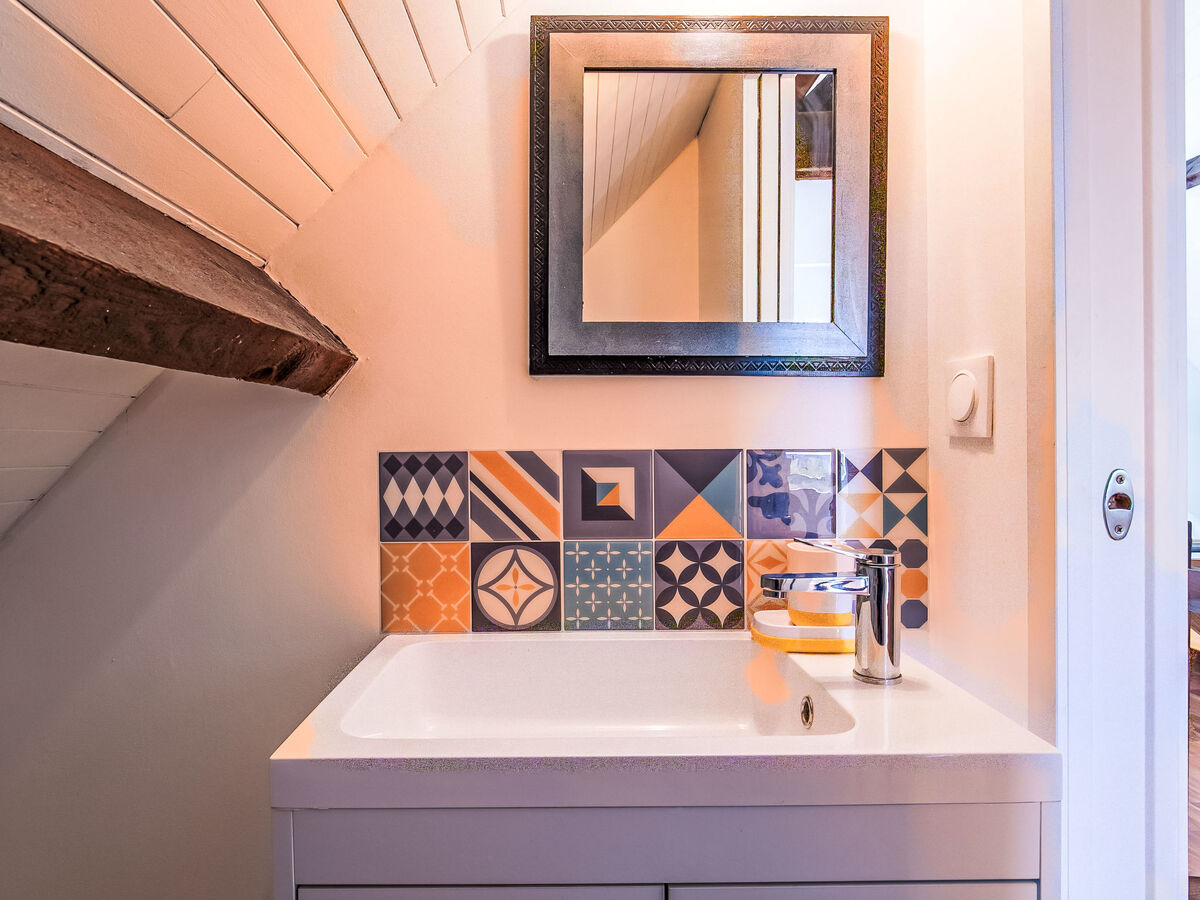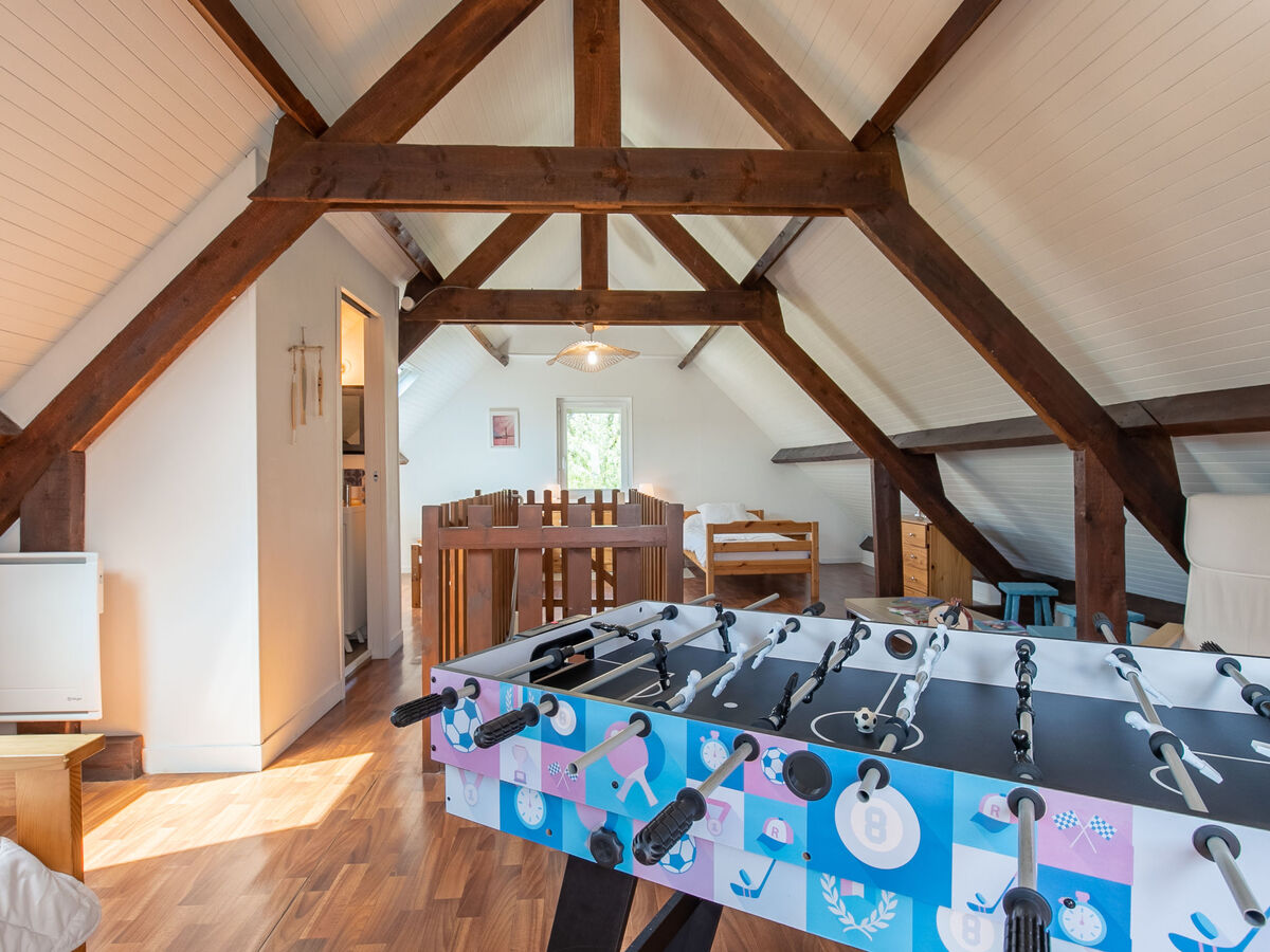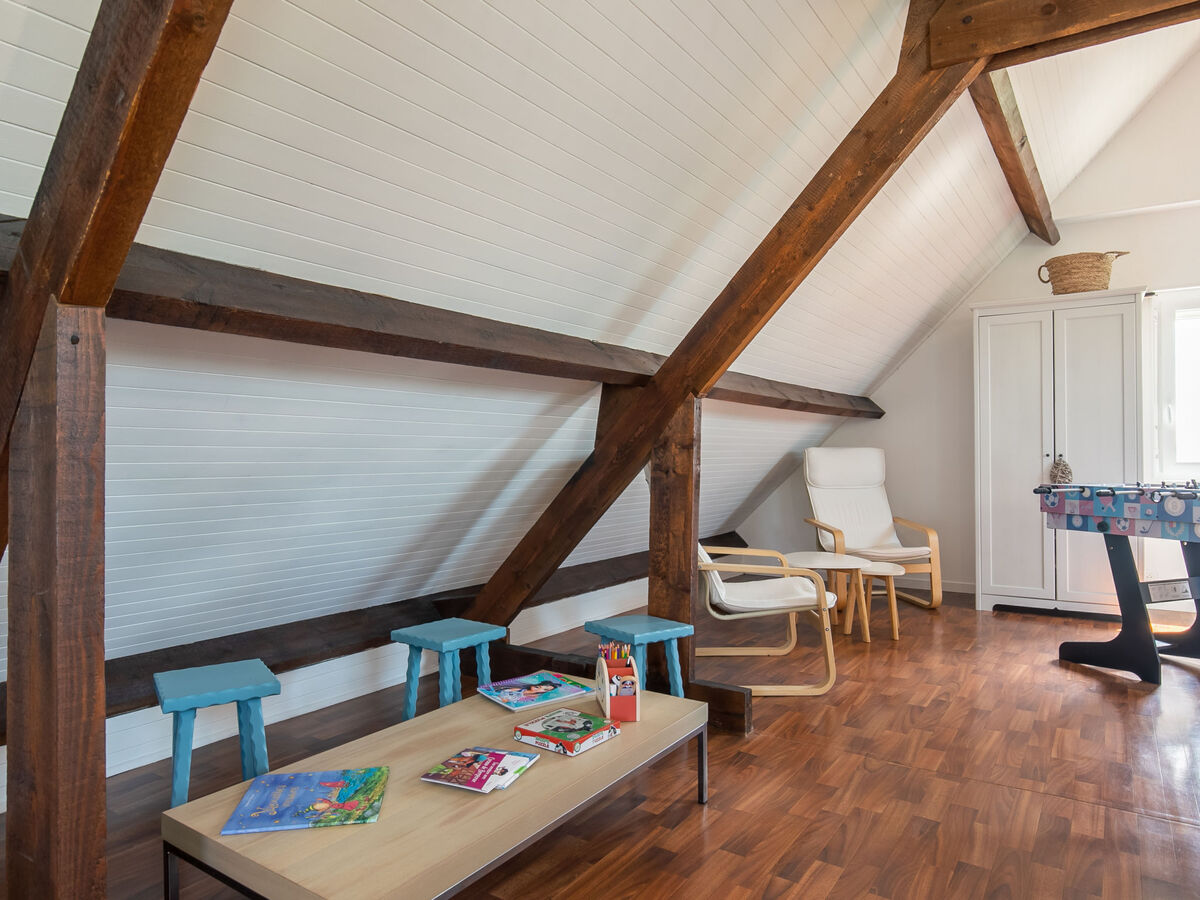 À l'étage supérieur: (escalier raide) séjour/chambre à coucher 20 m2, mansardé, ouvert avec 2 lits (90 cm, longueur 190 cm), chauffage électrique.