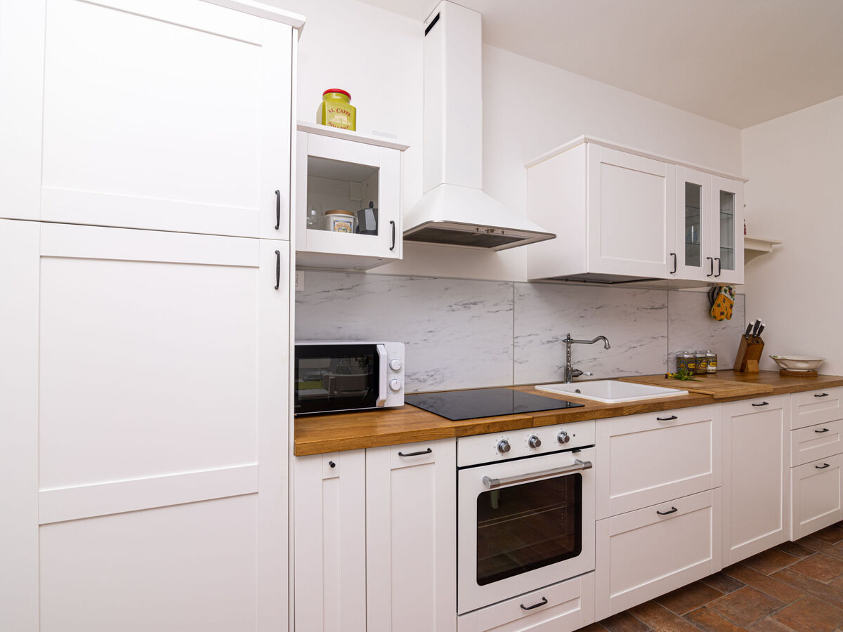 Grande cuisine (four, lave-vaisselle, 4 plaques à induction, congélateur, cafetière électrique) avec table pour les repas.