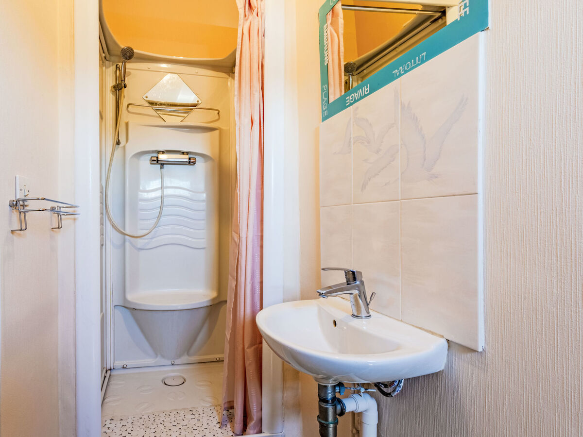 1 chambre avec 1 grand-lit (140 cm, longueur 190 cm), lavabo et douche/WC.