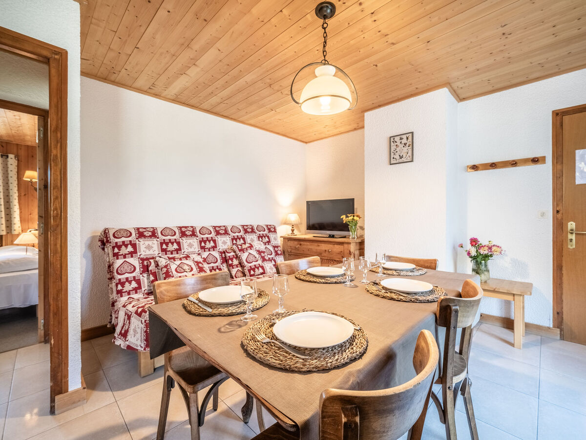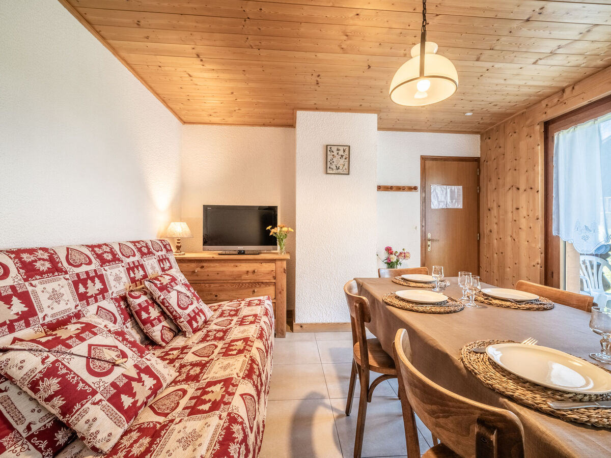 Aménagement fonctionnel et rustique: séjour/chambre à coucher avec 1 divan-lit double, table pour les repas et TV.