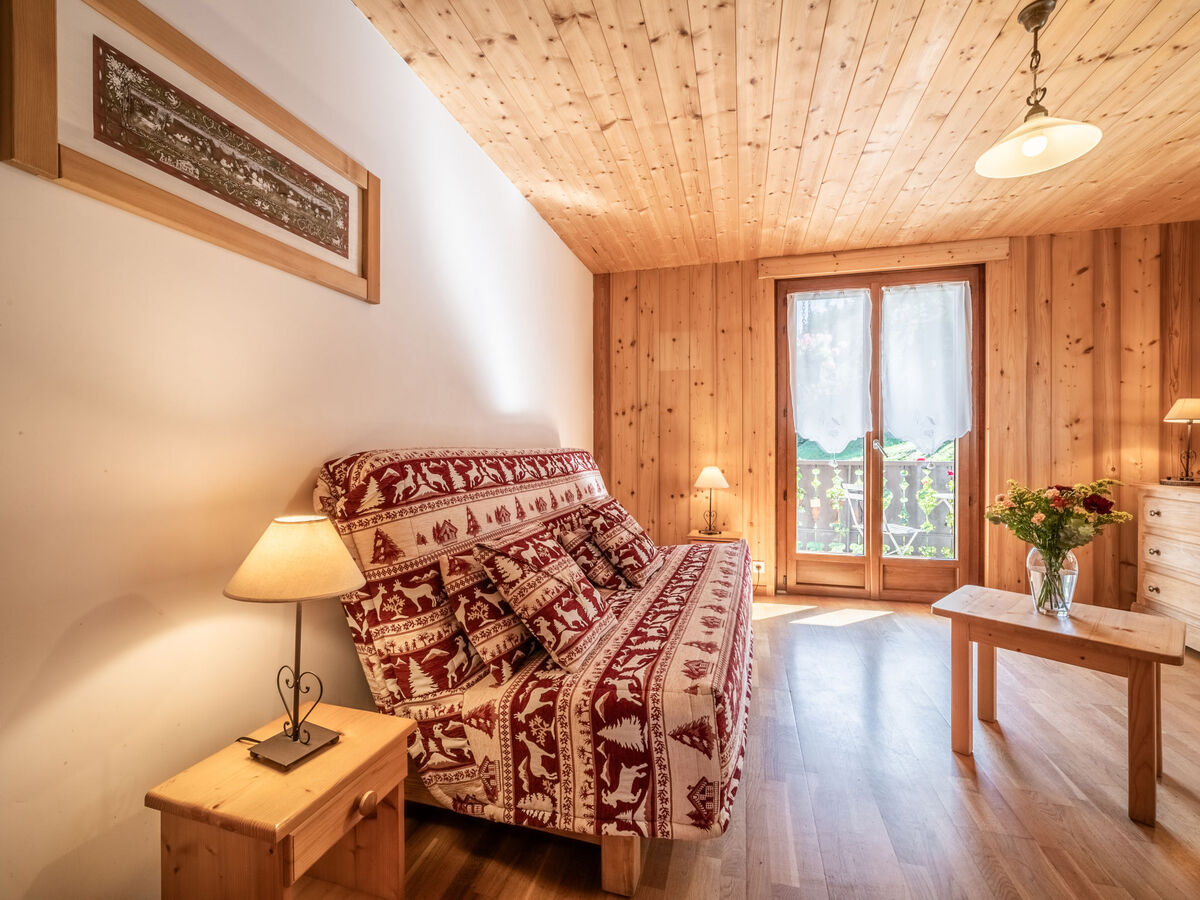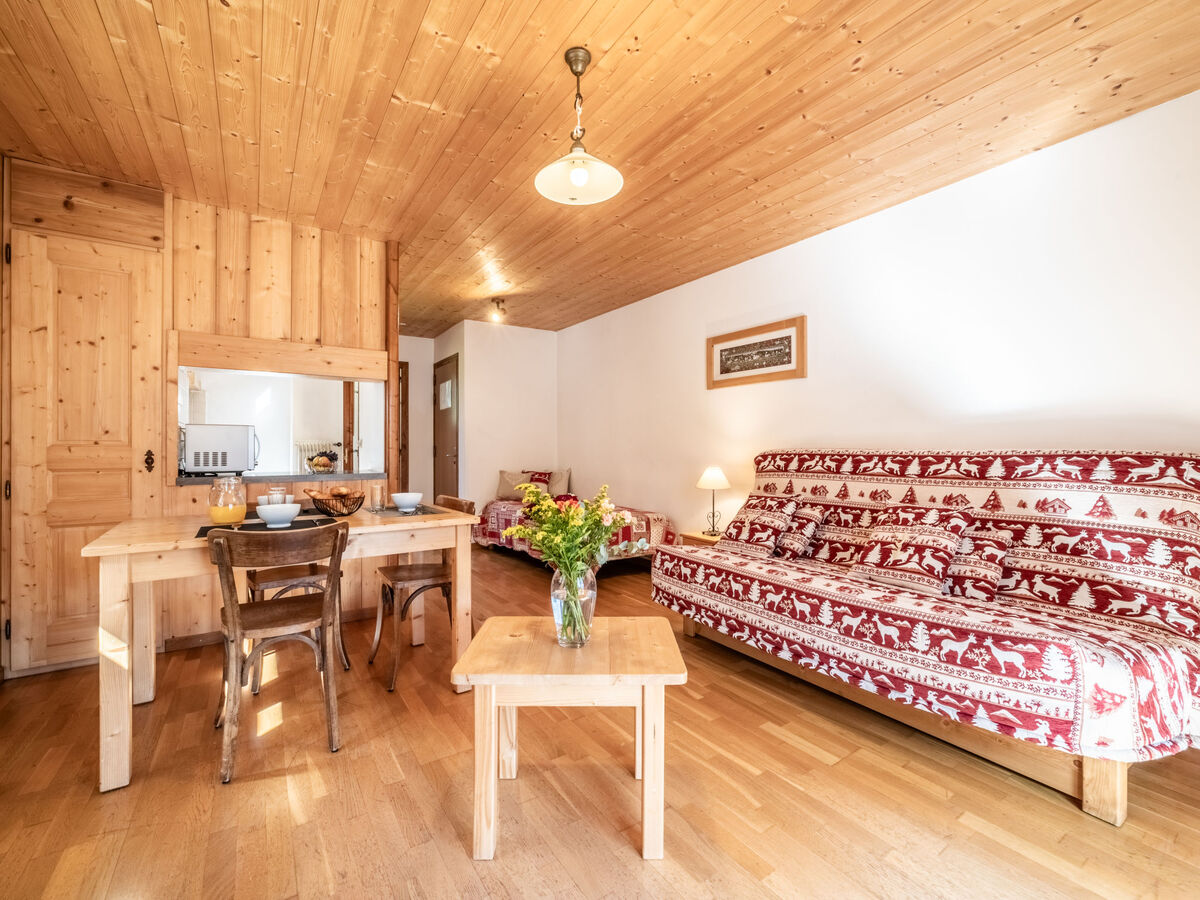 Aménagement fonctionnel et rustique: séjour/salle à manger avec 1 lit (90 cm), 1 divan-lit double, table pour les repas et TV.
