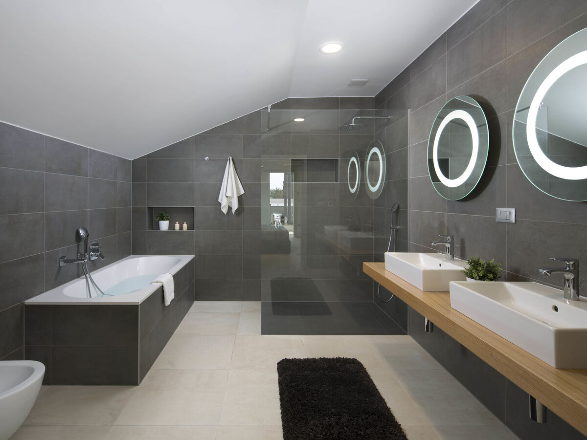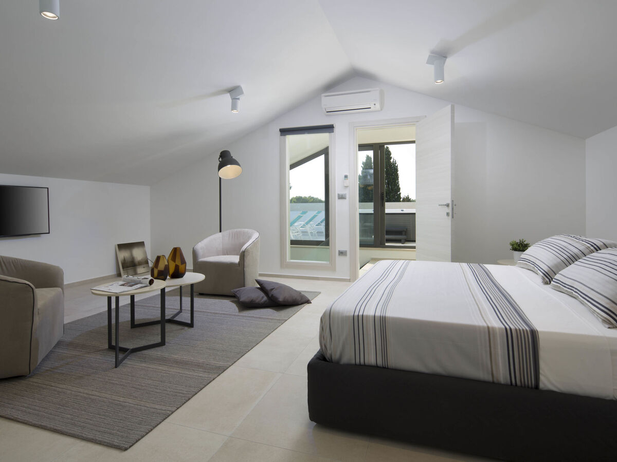 À l'étage supérieur: 1 chambre, mansardée hauteur plafond 140 - 250 cm avec Dressing avec 1 grand-lit (180 cm, longueur 200 cm), bain/douche/bidet/WC, double vasque et TV (satellite) (écran plat), air-conditionné.