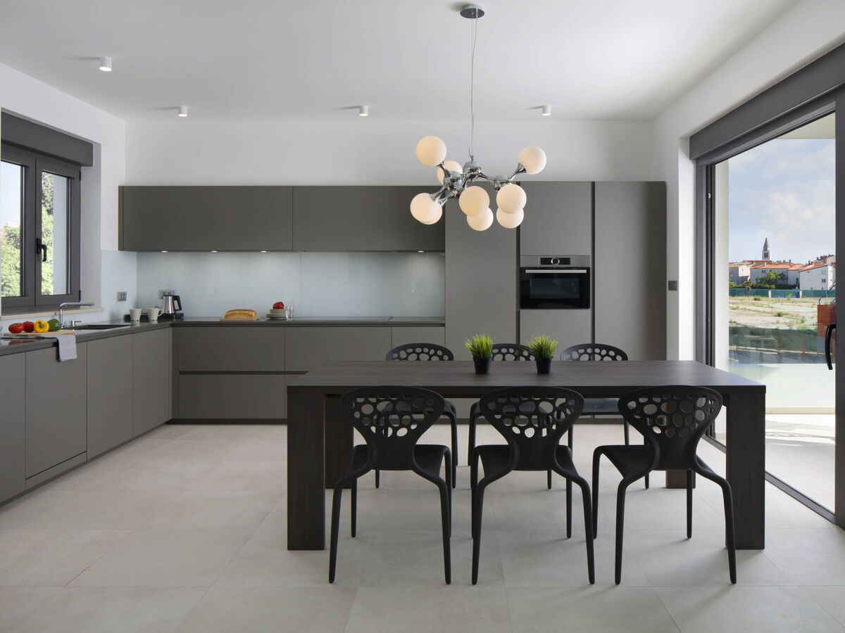 Cuisine ouverte (four, lave-vaisselle, 4 plaques vitrocéramiques, micro-ondes, congélateur, cafetière électrique).