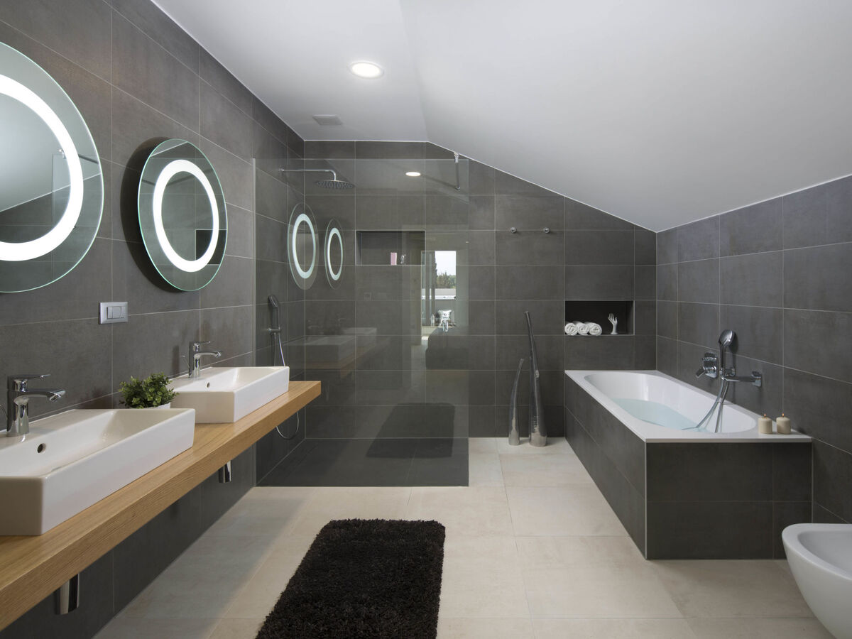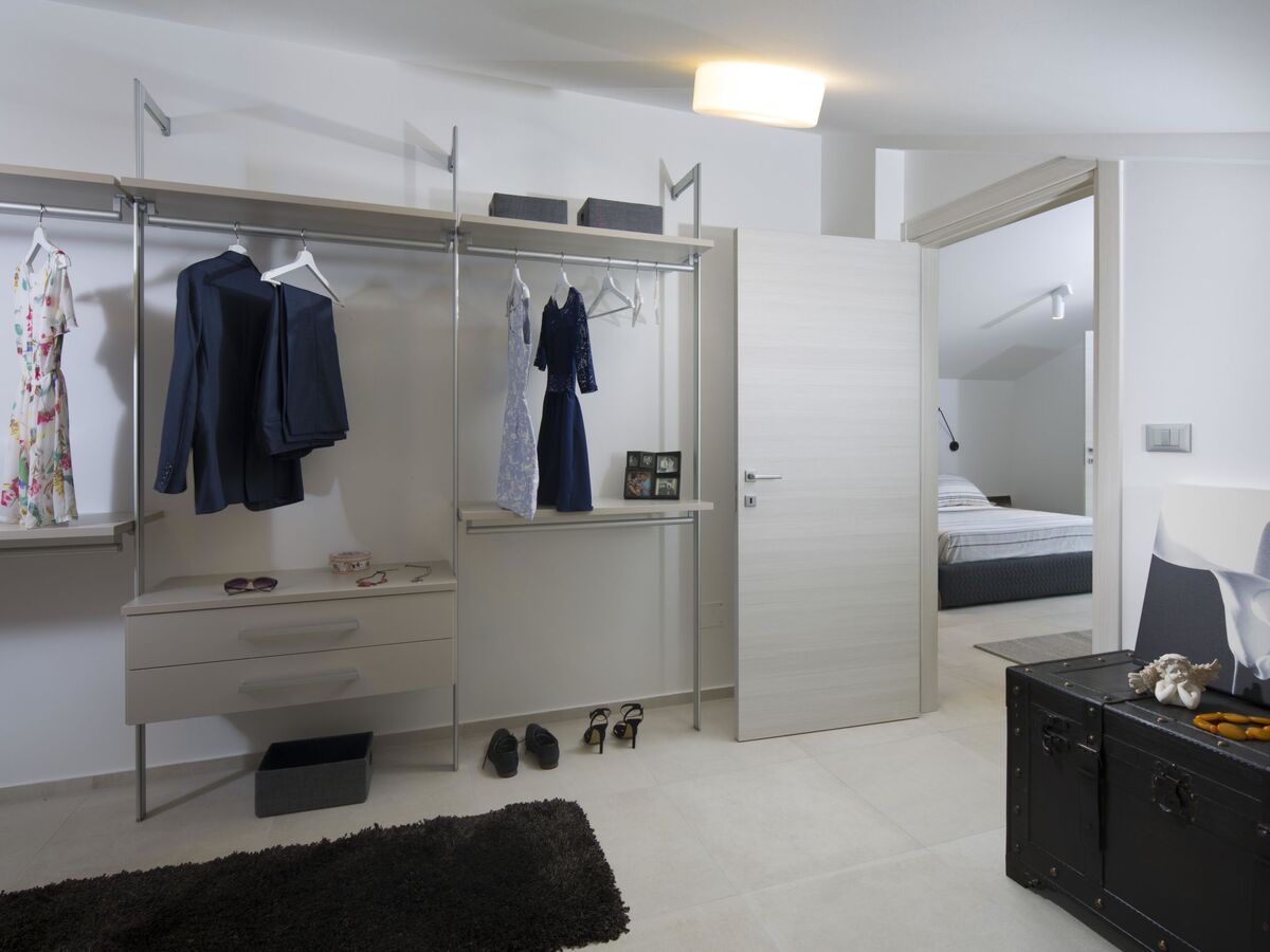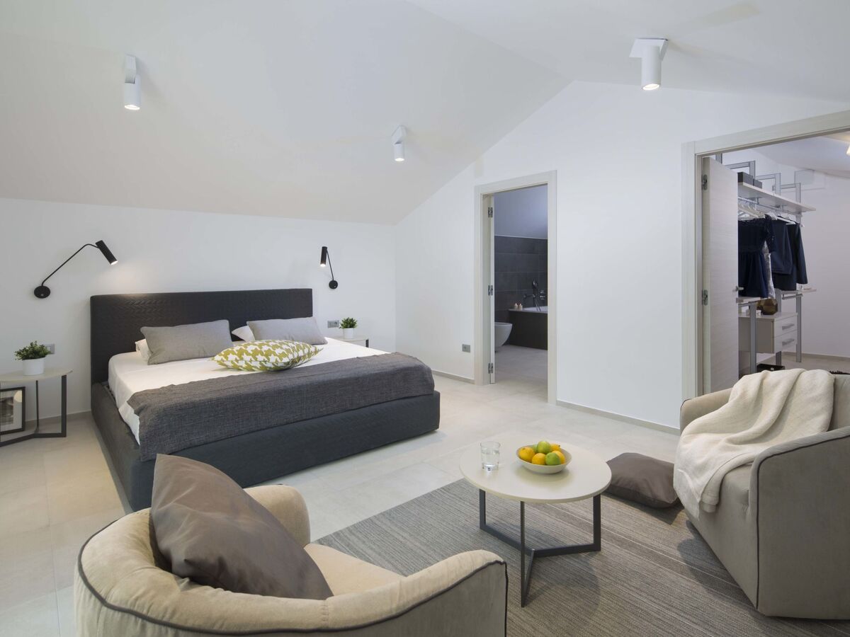 À l'étage supérieur: 1 chambre, mansardée hauteur plafond 140 - 250 cm avec Dressing avec 1 grand-lit (180 cm, longueur 200 cm), bain/douche/bidet/WC, double vasque et TV (satellite) (écran plat), air-conditionné.