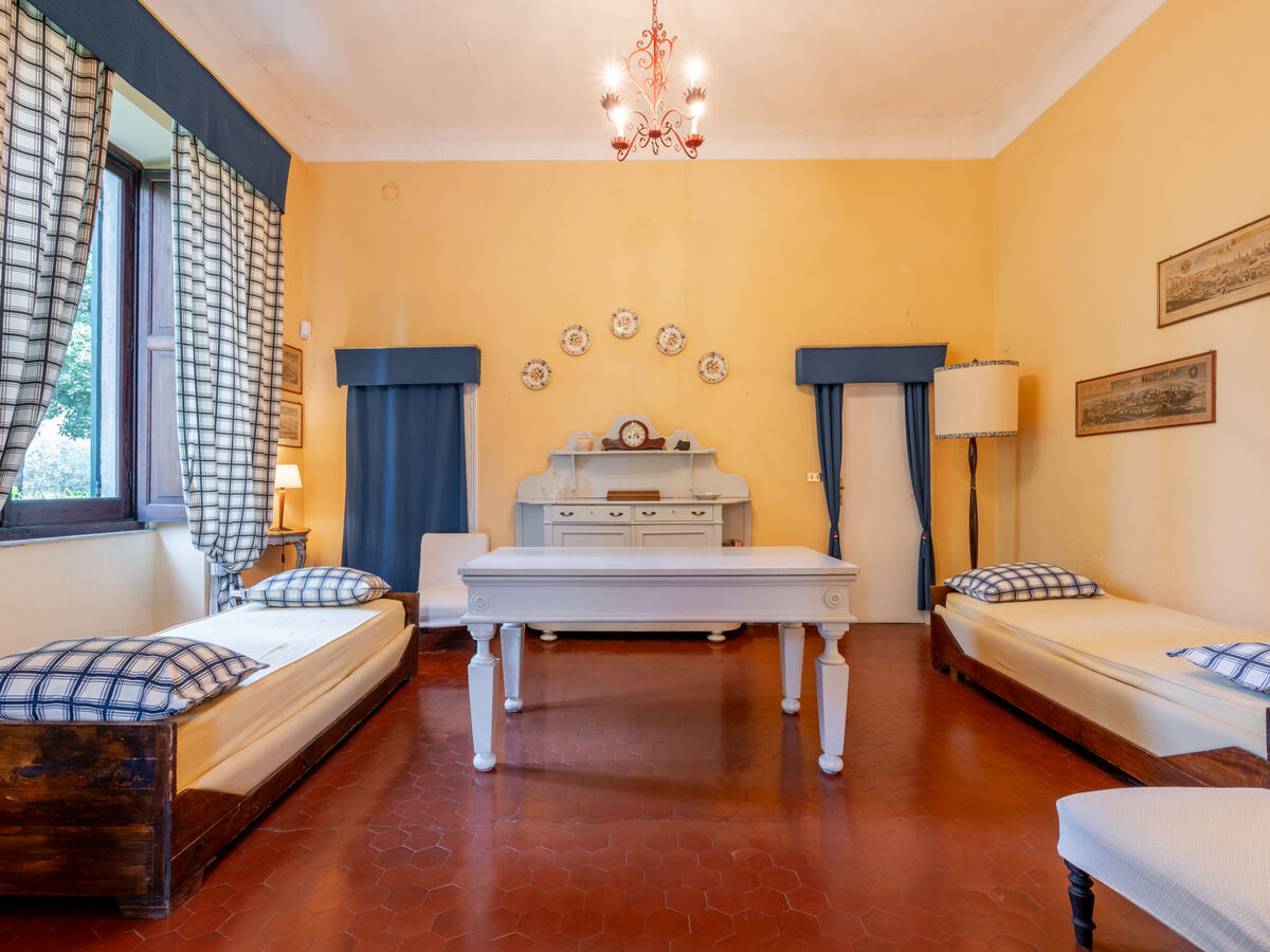 Aménagement simple et à l'ancienne: grand séjour avec 2 lits et TV.