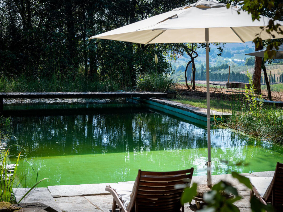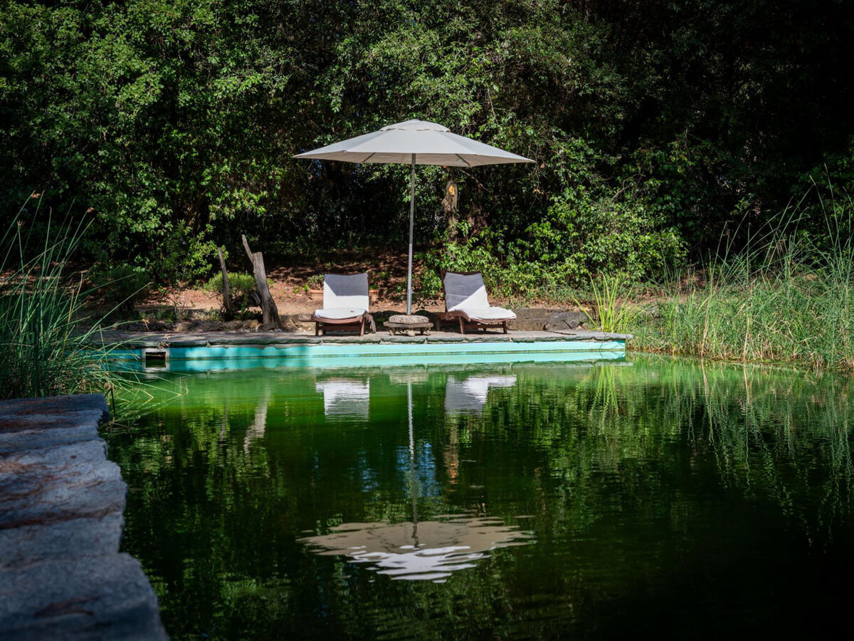 Piscine écologique à l'ombre des pins avec plantes aquatiques servant à filtrer l'eau sans produits chimiques.