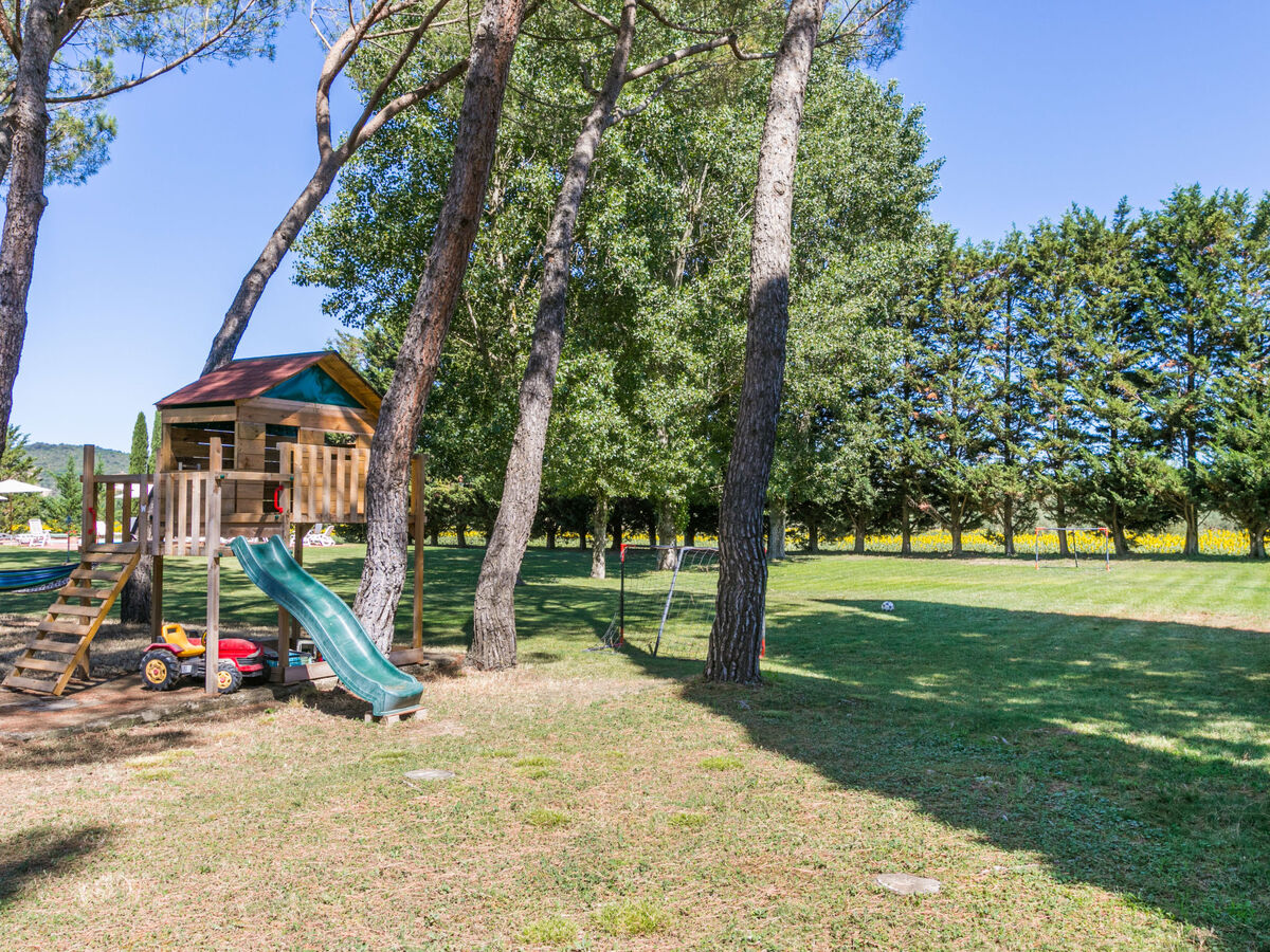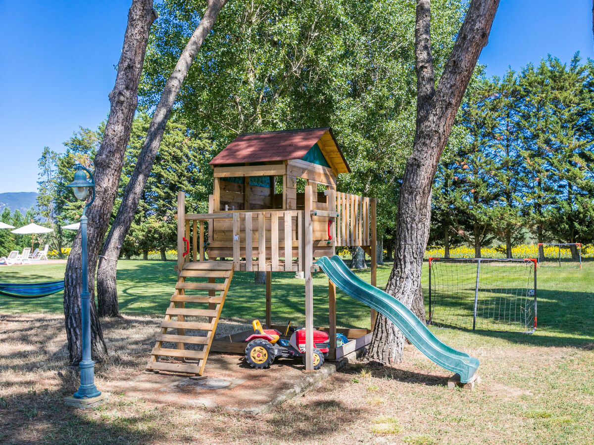 Douche extérieure, terrasse, meubles de jardin, barbecue, espace de jeux pour les enfants.