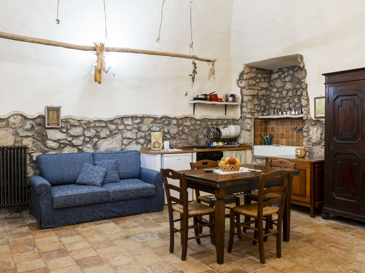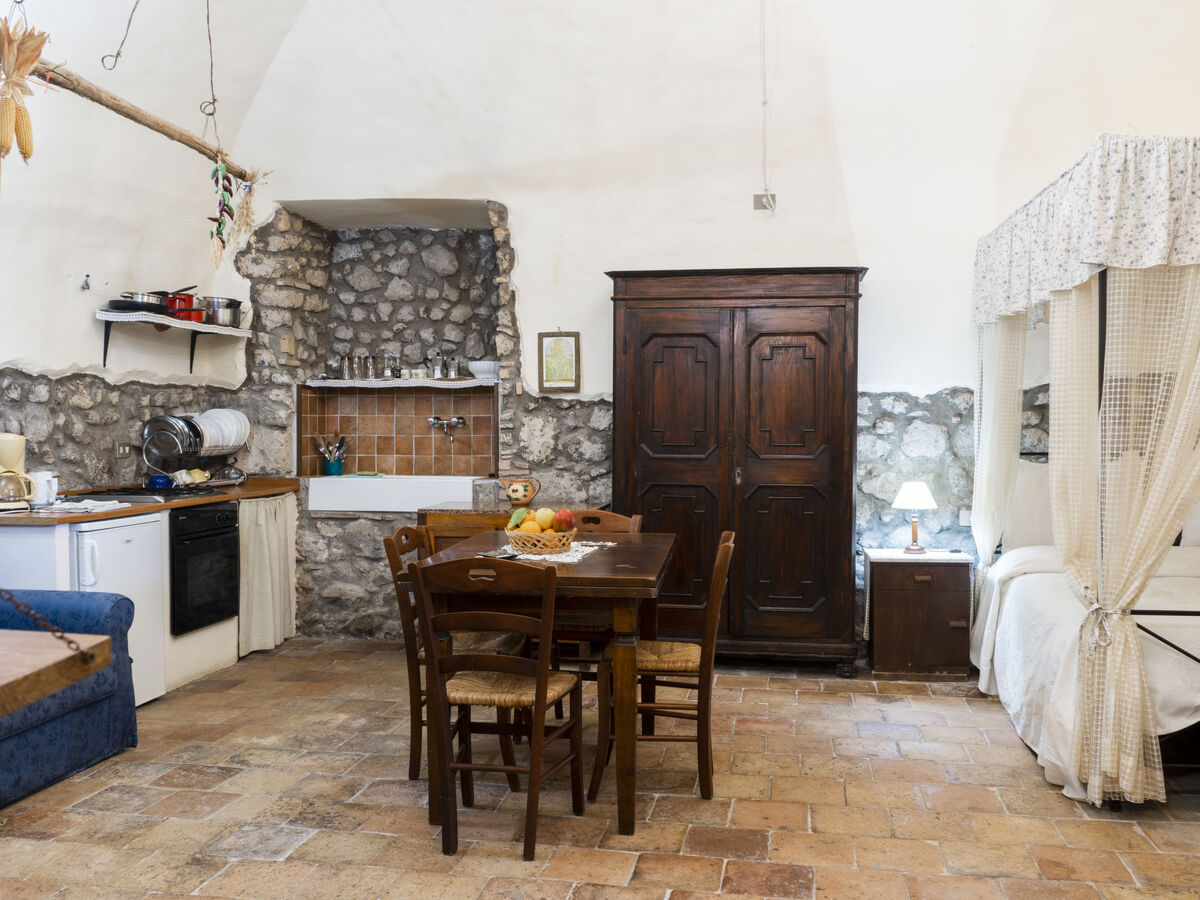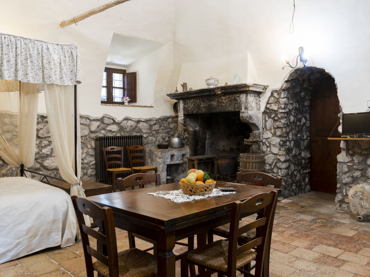 Rénové, aménagement rustique: séjour/chambre à coucher avec 1 divan-lit double et 1 grand-lit (160 cm), cheminée (uniquement à titre de décoration), table pour les repas et TV (satellite).