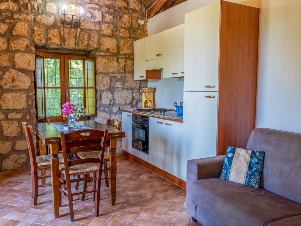 Rénové, aménagement rustique: séjour/chambre à coucher avec 1 divan-lit double, table pour les repas et TV (satellite).