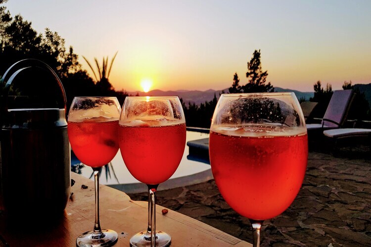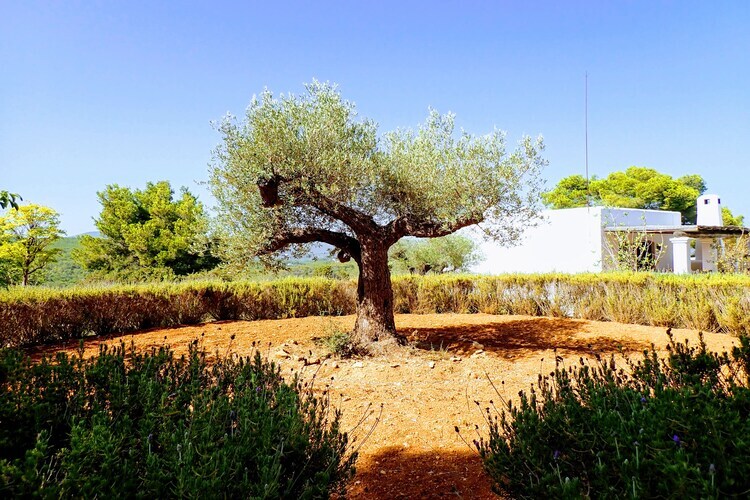 La terrasse derrière la maison principale comprend plusieurs coins pour s'asseoir sur une sorte de patio auprès du four à pain traditionnel et une très grande terrasse ensoleillée avec une table de pique-nique et suffisamment de transats élégants avec des coussins épais autour de la piscine au design unique de 14 x 5 avec des marches romaines et des places assises dans l'eau.