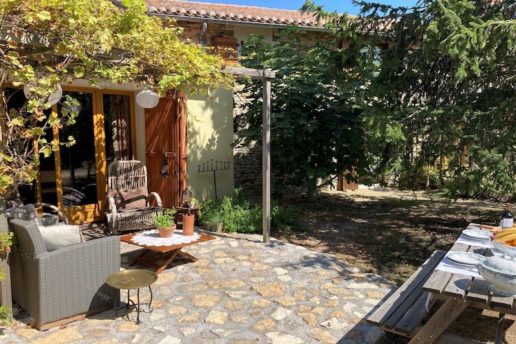 Devant la maison, vous trouverez une terrasse où vous pourrez commencer la journée de détente par un petit-déjeuner. À côté de la maison se trouve une autre terrasse ombragée avec un four à pain traditionnel. Le jardin commun est entièrement clôturé et il y a une aire de jeux pour les enfants.