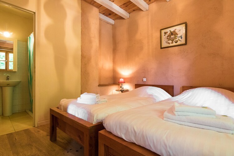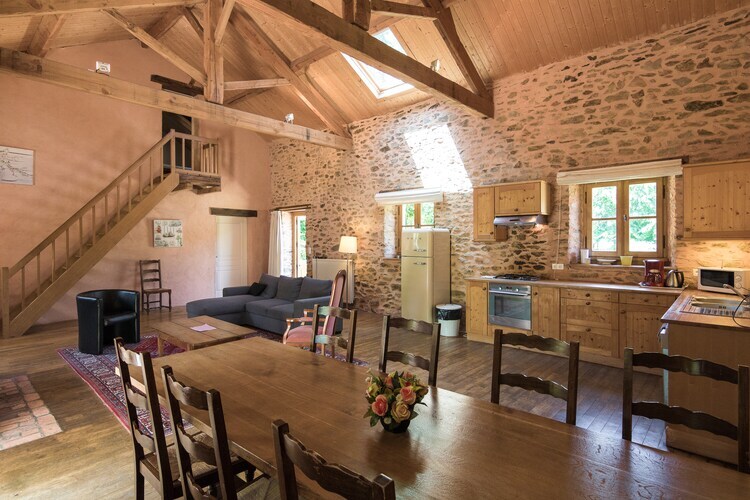 Rez-de-chaussée: (hall d'entrée, cuisine ouverte(plaque de cuisson(4 foyers), four(grill), lave-vaisselle , combinaison réfrigérateur/congélateur), salle à manger-salon(TV, cheminée, Lecteur DVD), chambre avec salle de bains(Lit double ou 2 x lit simple, douche, lavabo, WC), réserve(lavabo, lave-linge ), WC, urinoir) Au 1er étage: (chambre(lit double), chambre avec salle de bains(lit double, douche, lavabo, WC), salle de bains(baignoire-douche, lavabo, WC)) chauffage(central), terrasse(privé), mobilier de jardin, barbecue, trampoline, étang, piscine(partagé avec d'autres clients, 15 x 7 m., ouvert de Mai jusqu'à (inclus) Sept), court de tennis, terrain de pétanque, baby-foot, lit d'enfant(sur demande), chaise haute(sur demande), parc