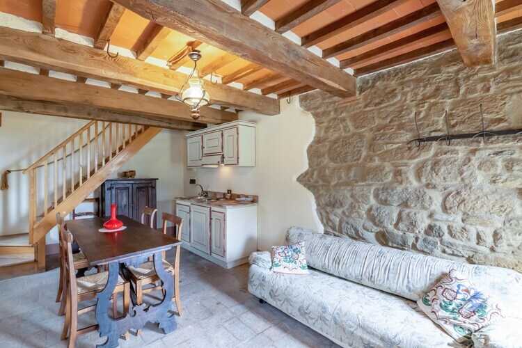 Dans la ville tranquille qui fut le lieu de naissance de Michel-Ange, nous trouvons cette charmante ferme au pied des Apennins, avec des vues splendides sur le domaine, des murs en pierre, des poutres en châtaignier et des sols originaux en terre cuite.
