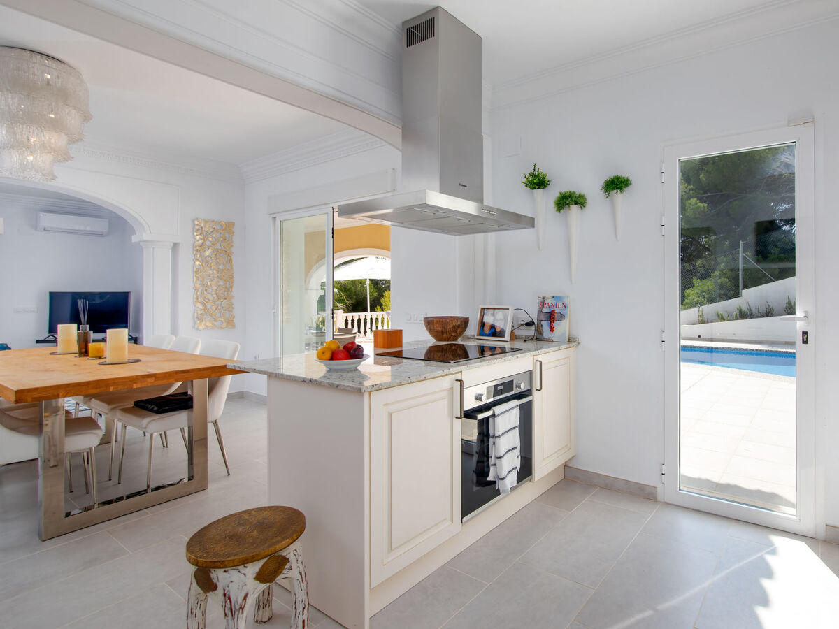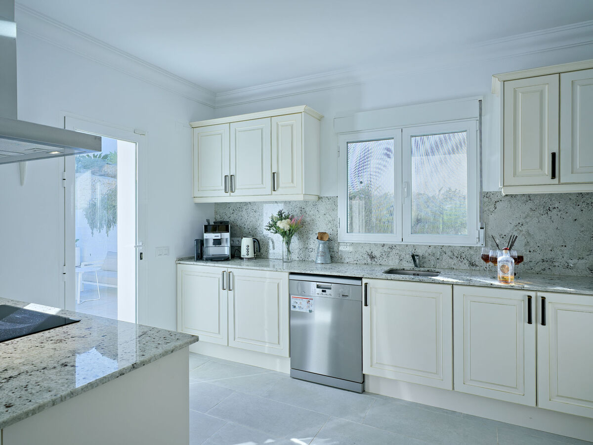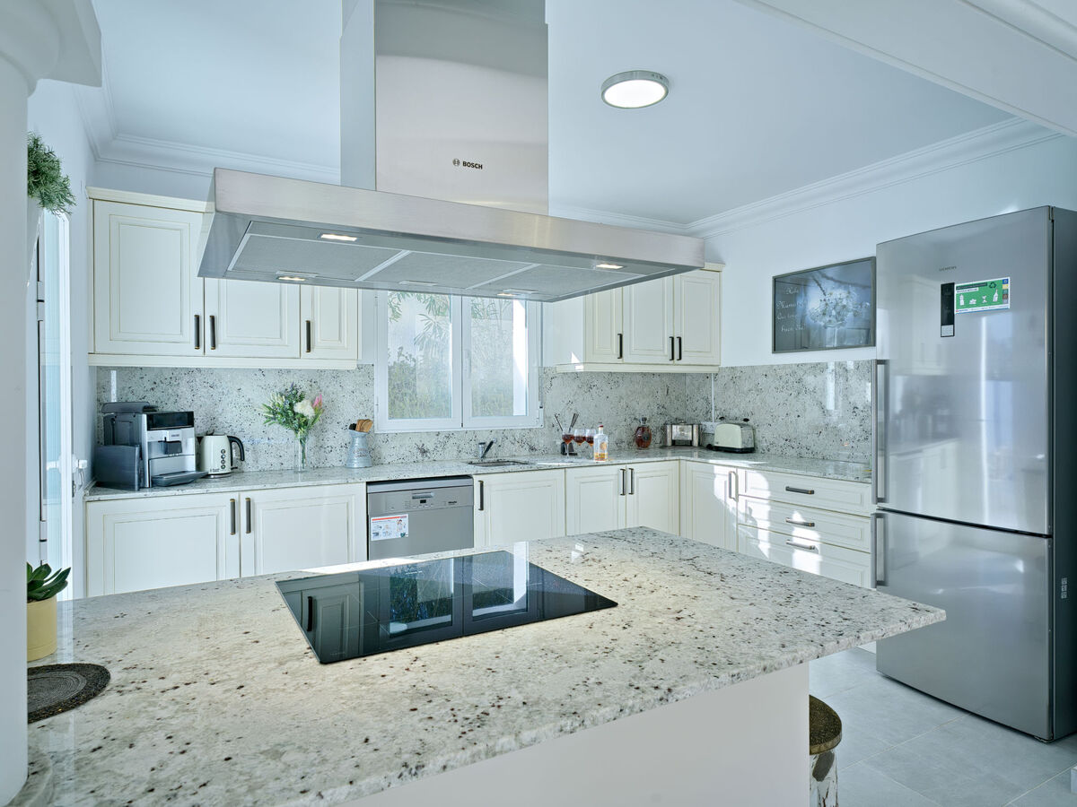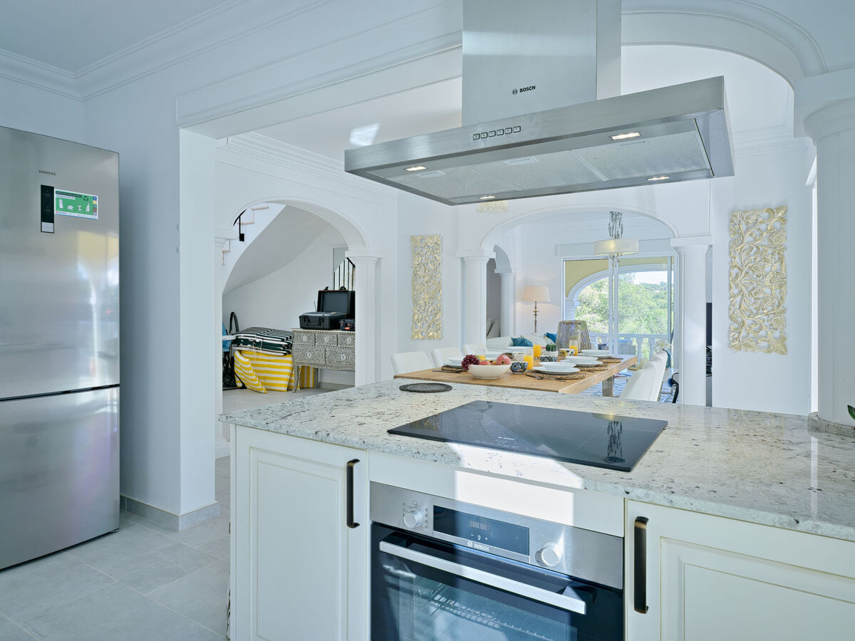 Cuisine ouverte (four, lave-vaisselle, 3 plaques vitrocéramiques, grille-pain, congélateur, cafetière électrique) avec air-conditionné et chauffage à air chaud.