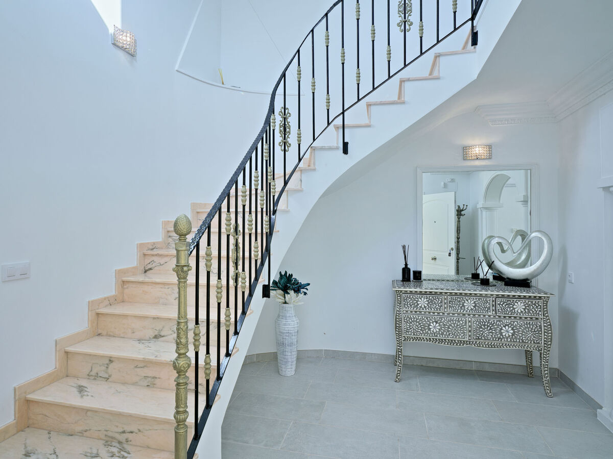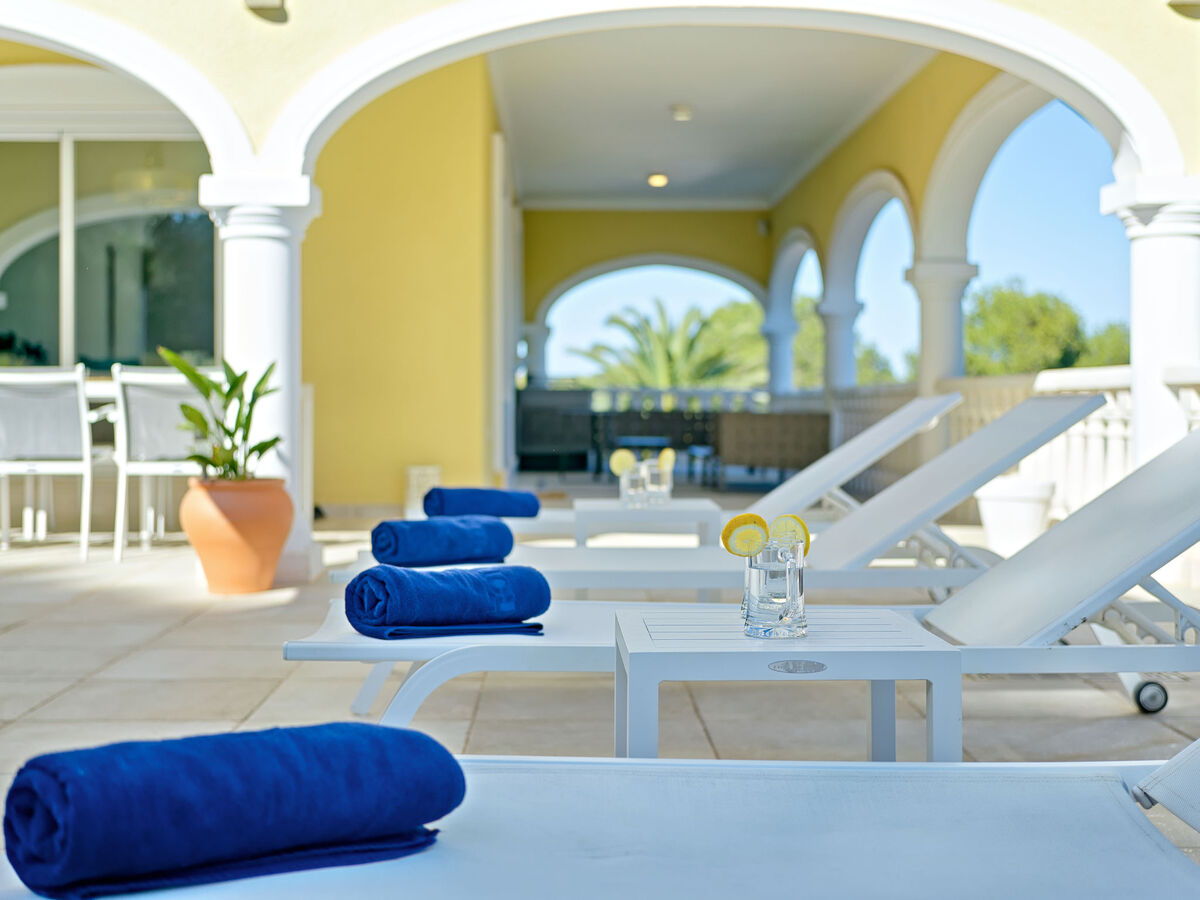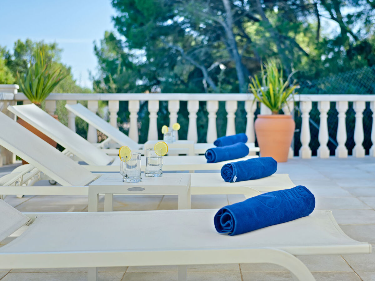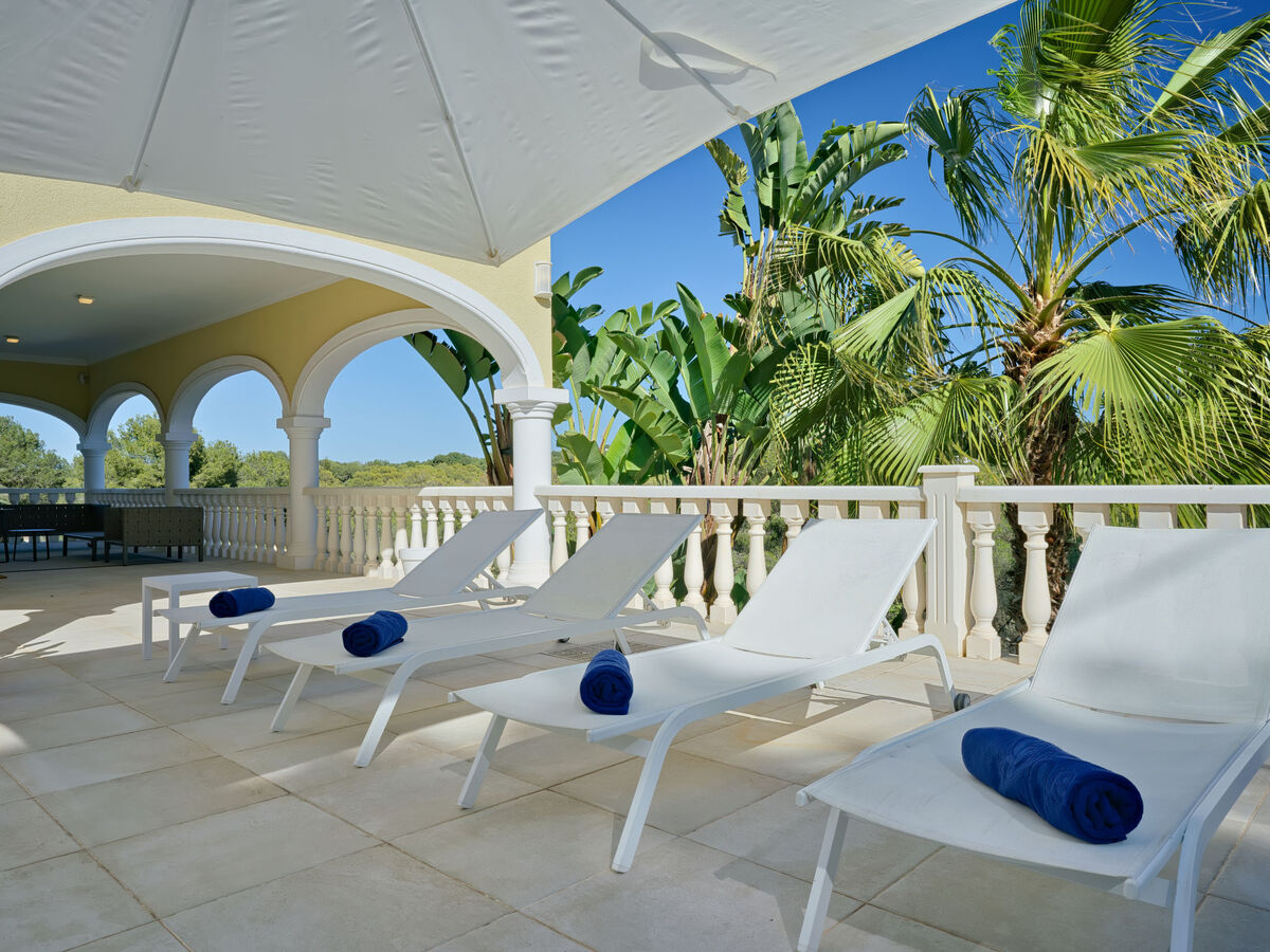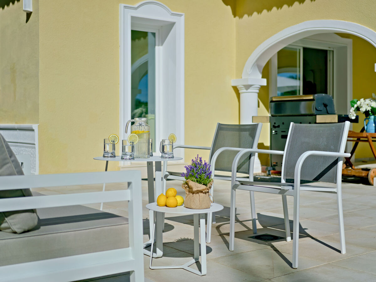 Meubles de terrasse, barbecue, chaises longues, loggia.