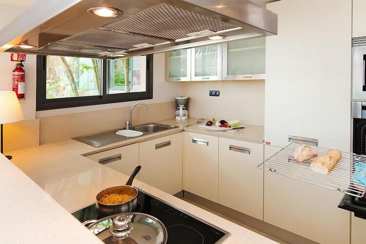 Rez-de-chaussée: (cuisine ouverte(bouilloire, grille-pain, plaque de cuisson(vitrocéramique), cafetière/percolateur, four, micro ondes, combinaison réfrigérateur/congélateur), salle à manger-salon(TV(satellite, chaînes de télévision allemandes), Lecteur DVD)) Au 1er étage: (chambre avec salle de bains(lit double, baignoire, WC), chambre avec salle de bains(lit simple, lit simple, douche, WC)) grill, douche(extérieur), lave-linge , balcon, climatisation, terrasse, jardin, mobilier de jardin, transats, parking, piscine(privé, extérieur, chauffable), chaise haute, baby crib(free)