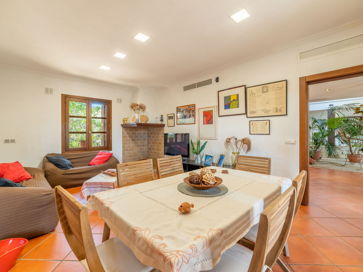 Spacieux et clair, aménagement très confortable et agréable: salle à manger avec cheminée et table pour les repas.