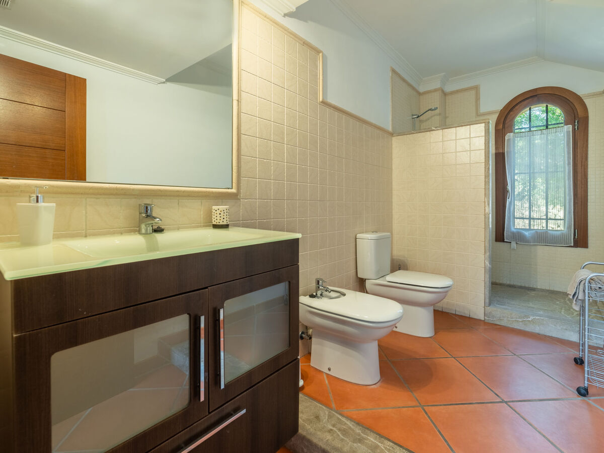 À l'étage supérieur: 1 grande chambre double avec baie vitrée Dressing avec 1 grand-lit (150 cm, longueur 200 cm), bain/bidet/WC, double vasque, bain à remous , air-conditionné et chauffage à air chaud.
