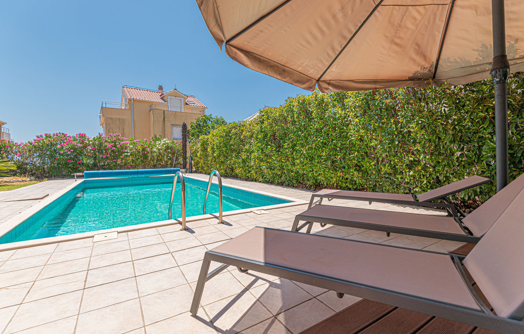 L'espace extérieur répond également à tous les souhaits. La grande piscine vous rafraîchira les jours de grande chaleur, tandis que vous vous détendrez sur les chaises longues. La terrasse couverte avec des sièges et un barbecue vous invite à prendre des repas agréables en plein air.