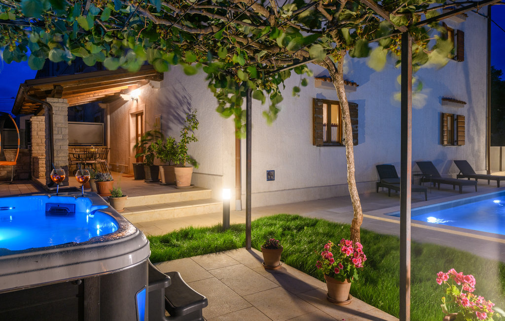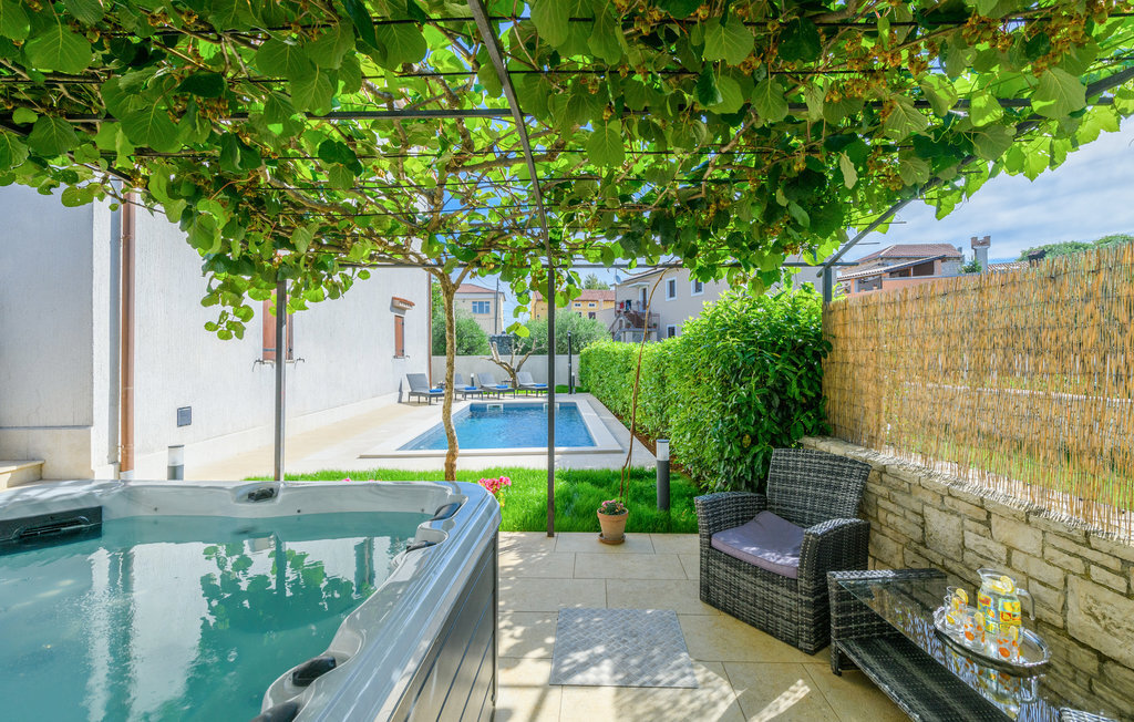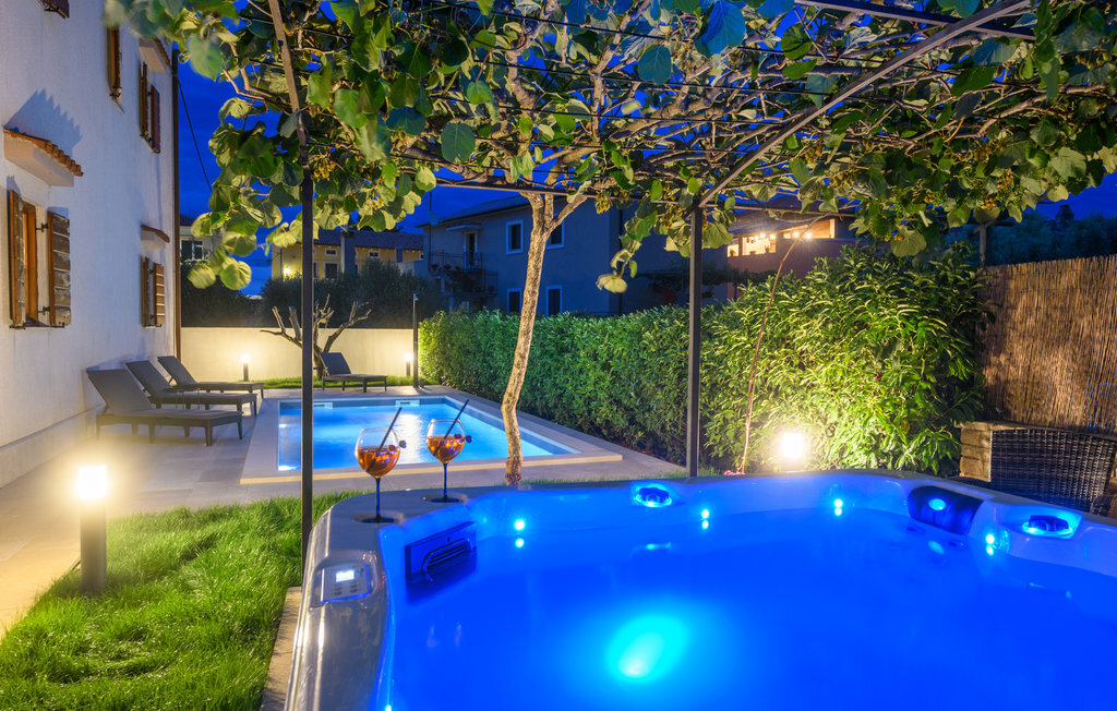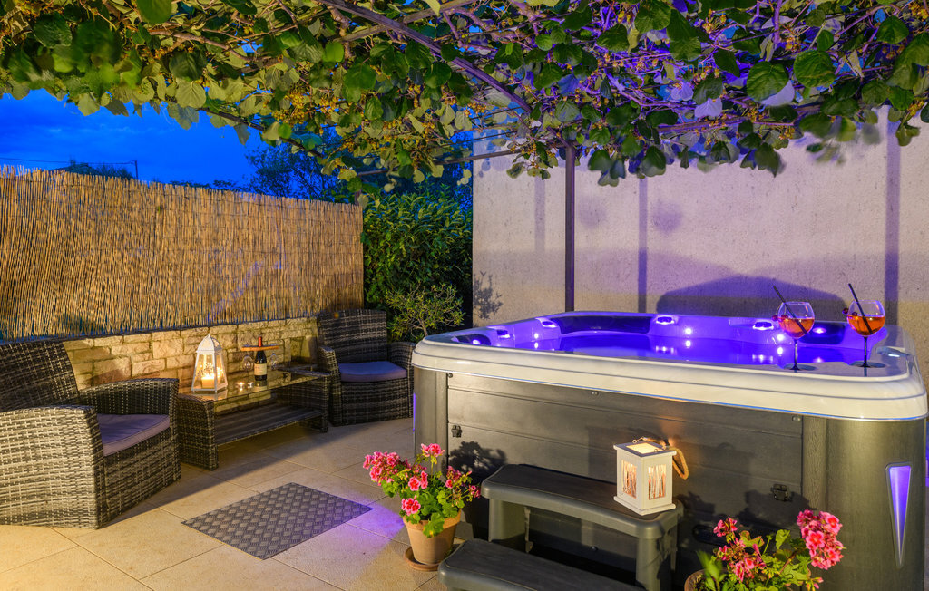 Bien-être à l'extérieur : Location de vacances disposant de chaises-longues et d'un ou plusieurs équipements tels que piscine extérieure, jacuzzi extérieur, lit à baldaquin de jardin etc...