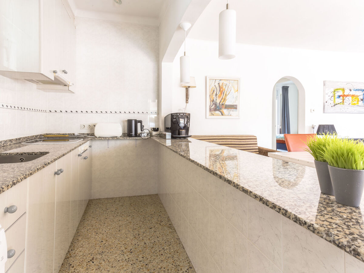 Cuisine ouverte (four, lave-vaisselle, 3 plaques à induction, congélateur, cafetière électrique) avec bar.