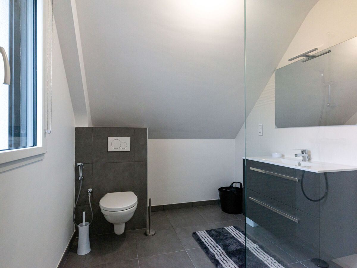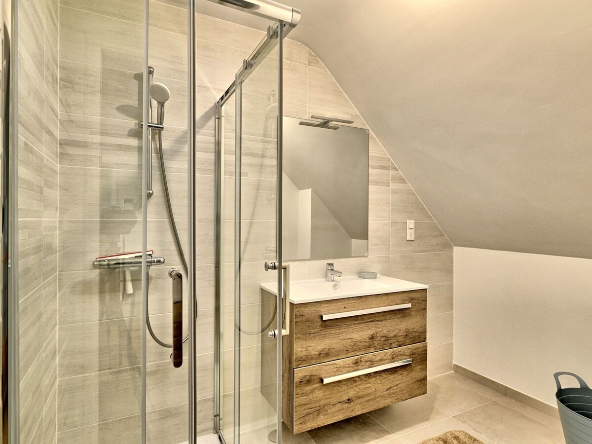 À l'étage supérieur: 1 chambre avec 1 grand-lit (160 cm, longueur 200 cm), douche/WC.