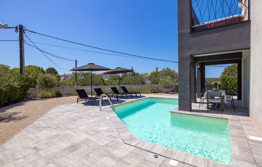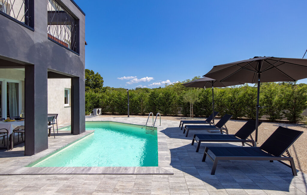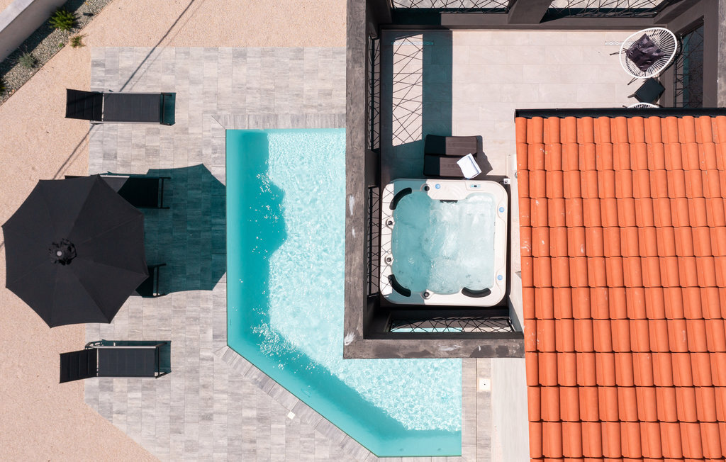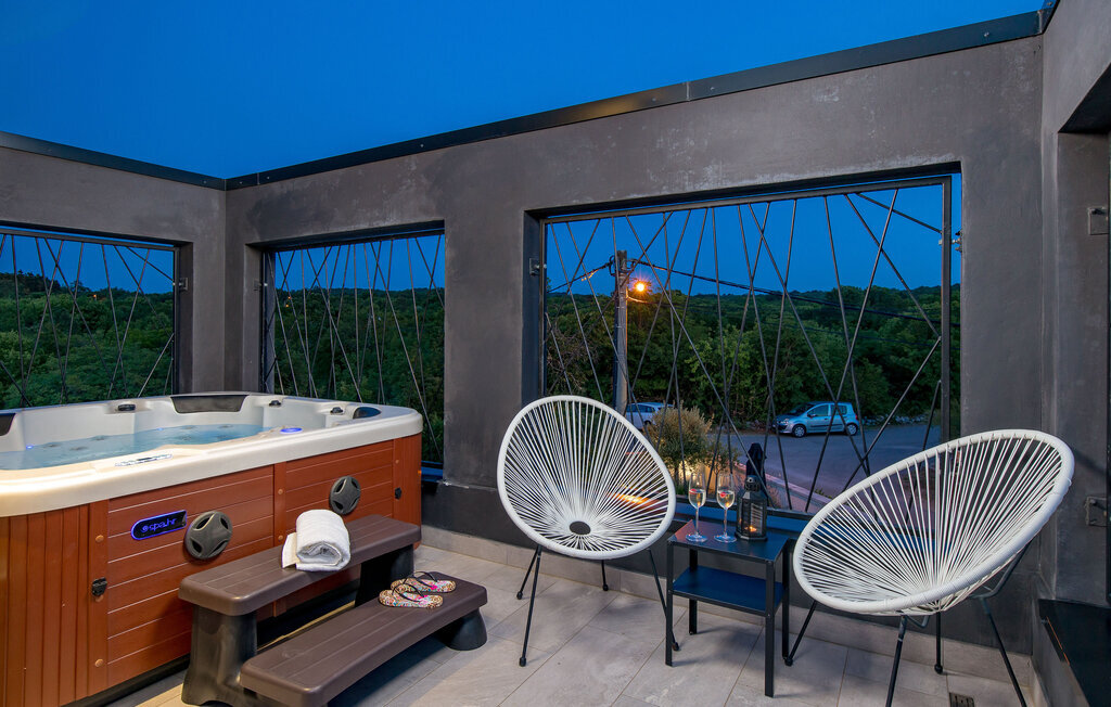 Bien-être à l'extérieur : Location de vacances disposant de chaises-longues et d'un ou plusieurs équipements tels que piscine extérieure, jacuzzi extérieur, lit à baldaquin de jardin etc...