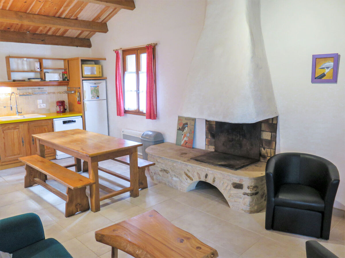 Aménagement fonctionnel: séjour/salle à manger avec cheminée, table pour les repas et TV (écran plat).