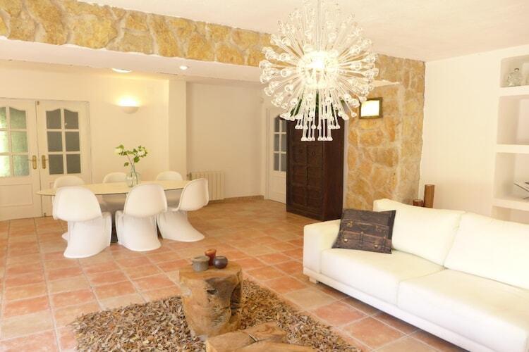 À l'intérieur, cette jolie villa comprend des espaces serrés et chaleureux dont vous jouirez à fond. La villa est aménagée avec style et modernité. Vous pouvez bien vous relaxer près de la TV ou avec de la musique qui sort de l'installation musicale par iPod. Vous pouvez aussi vous détendre près du feu ouvert où vous pouvez vous asseoir dans l'intimité du crépitement d'un petit feu en arrière-plan. Devant l'appartement, il y a une vaste terrasse avec un coin à manger en bois et autour de la vaste piscine avec des marches romaines, il y a une terrasse ensoleillée avec des transats pleins de style. Il y a aussi le petit bar près du coin de relaxation couvert, une magnifique base de séjour pour votre aventure à Ibiza.