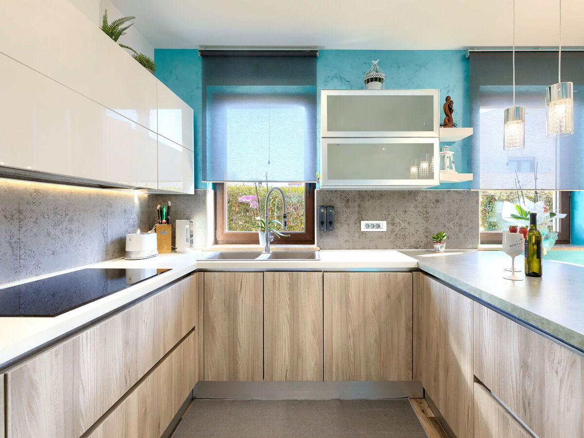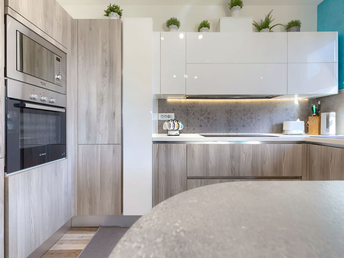 Cuisine ouverte (four, lave-vaisselle, 4 plaques à induction, bouilloire électrique, micro-ondes, cafetière électrique).