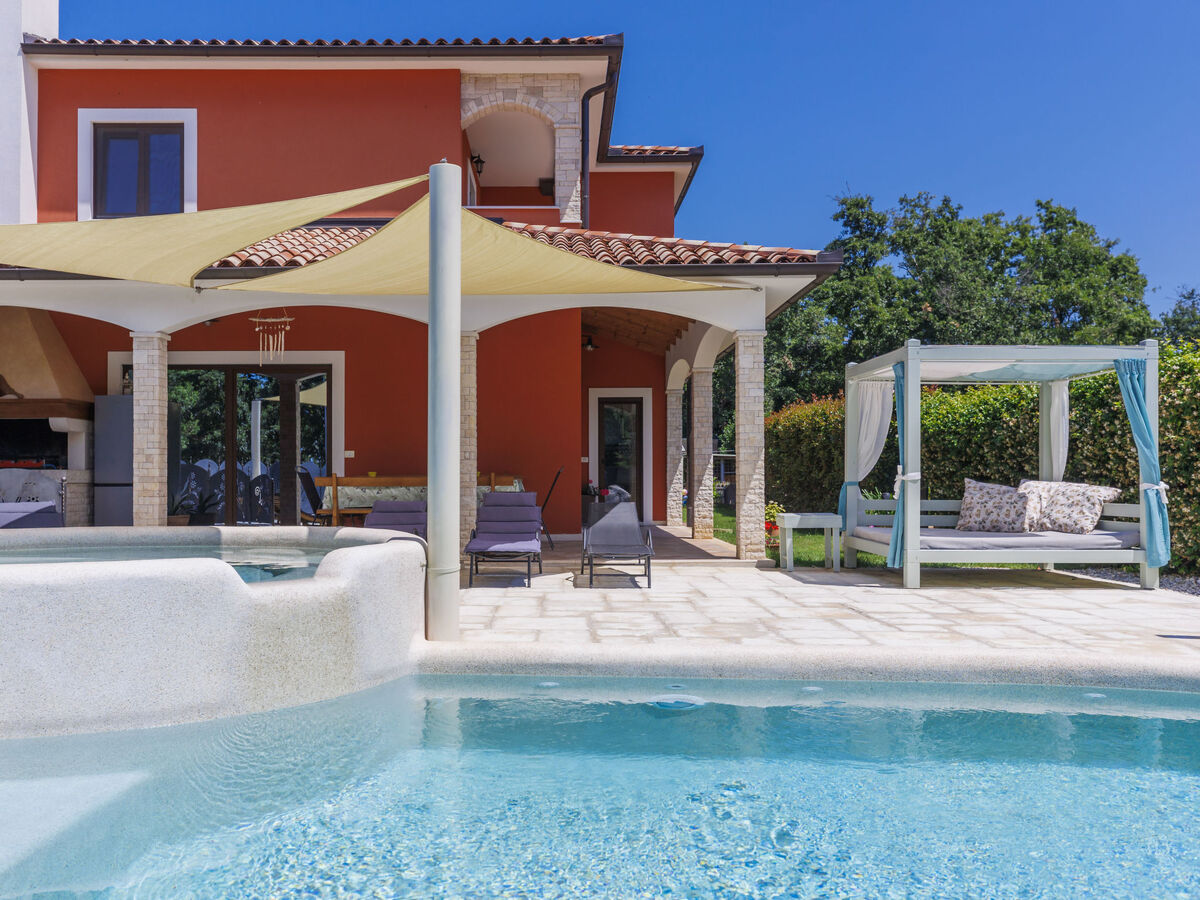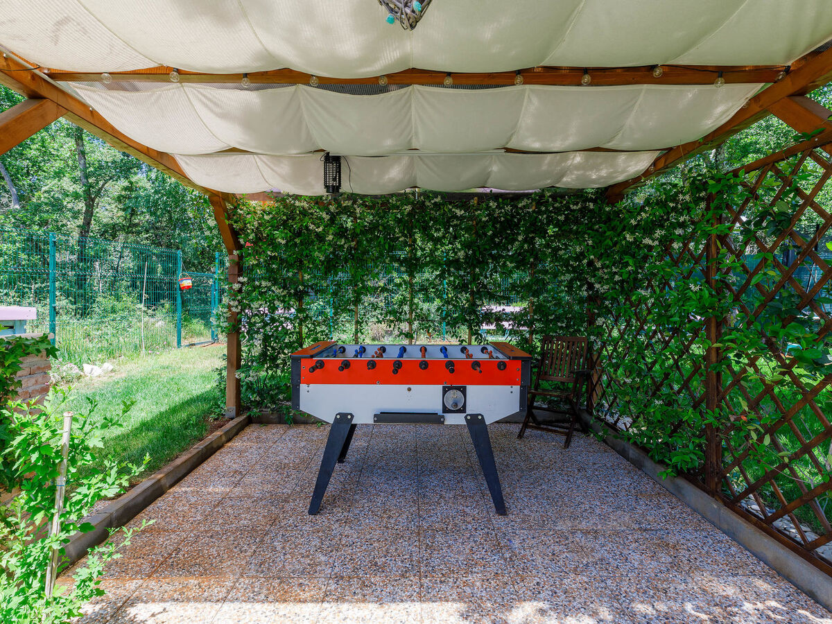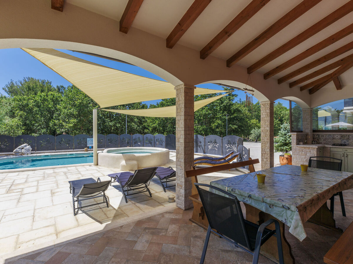 A usage privé: terrain 700 m2, jardin avec pelouse, piscine en forme d’haricot, chauffée (40 m2, profondeur 15 - 140 cm, disponibilité saisonnière: 01.Jan.