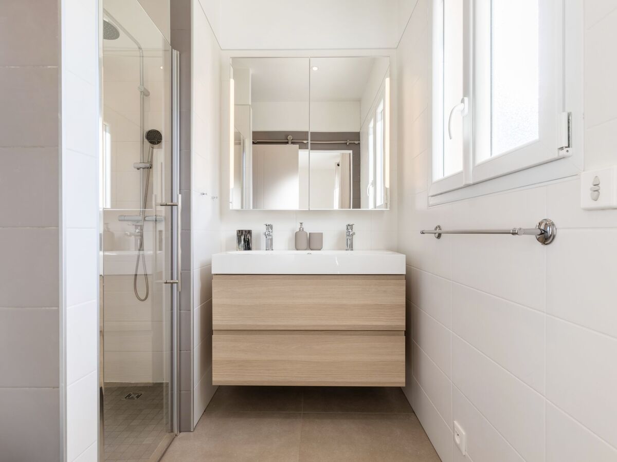 1 chambre avec Dressing avec 1 grand-lit (160 cm, longueur 190 cm), douche/WC.