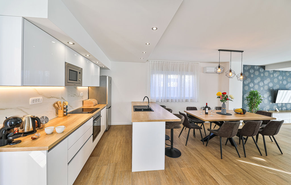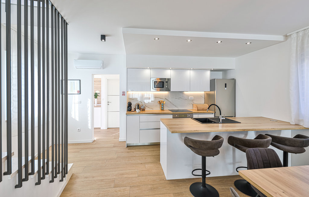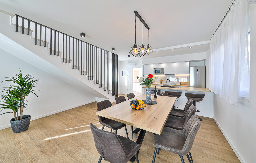 Vous et votre communauté de vacances allez pouvoir profiter pleinement de ce logement moderne. Situé à quelques kilomètres à l'ouest de Split, un équipement flambant neuf et élégant vous attend. Grâce aux 4 chambres à coucher et aux 4 salles de bains, l'intimité de tous les hôtes est garantie. Par beau temps, vous prendrez sans doute volontiers vos repas dans l'agréable salle à manger située à côté de votre propre piscine.
