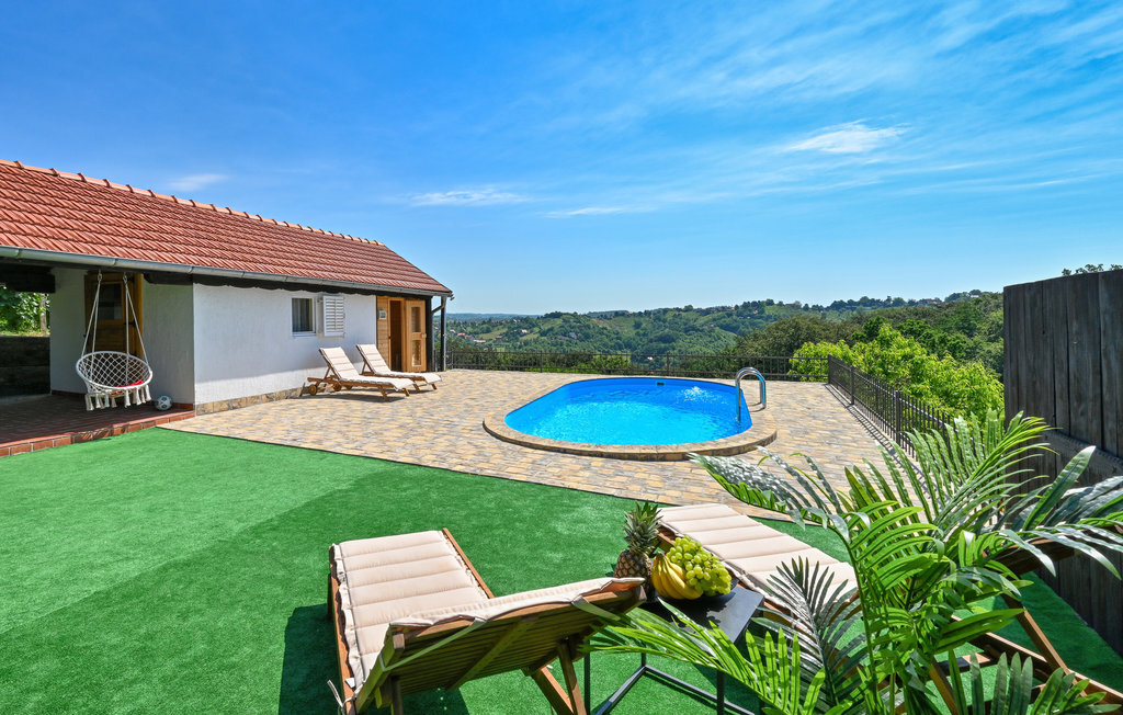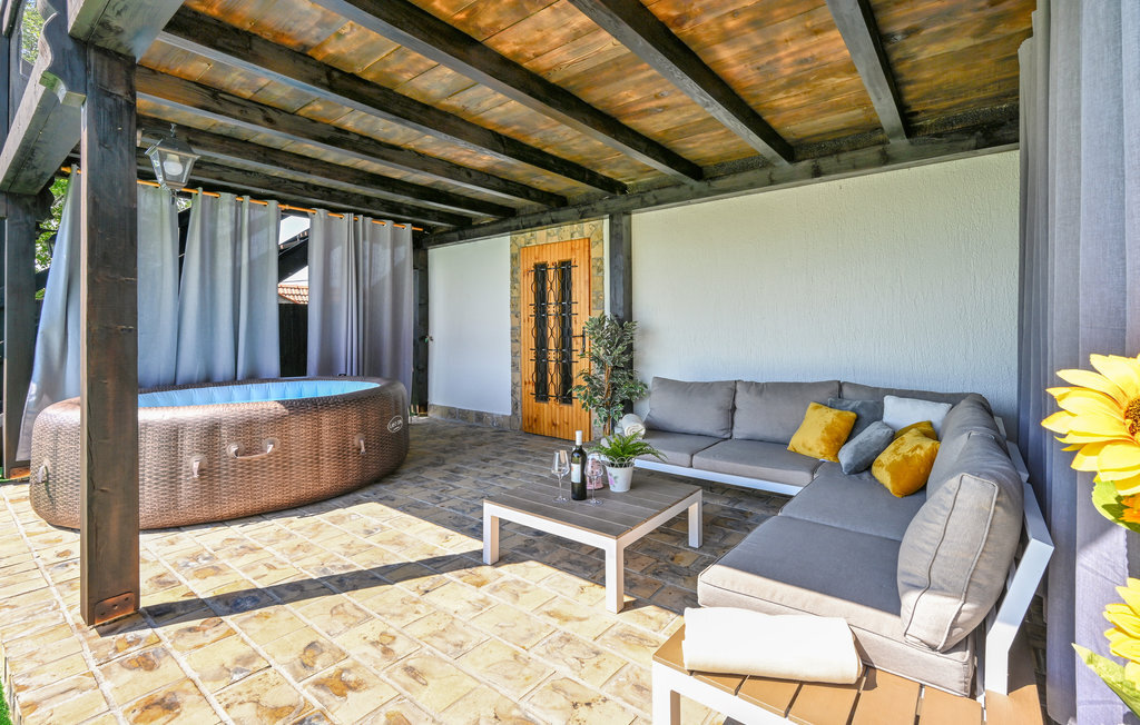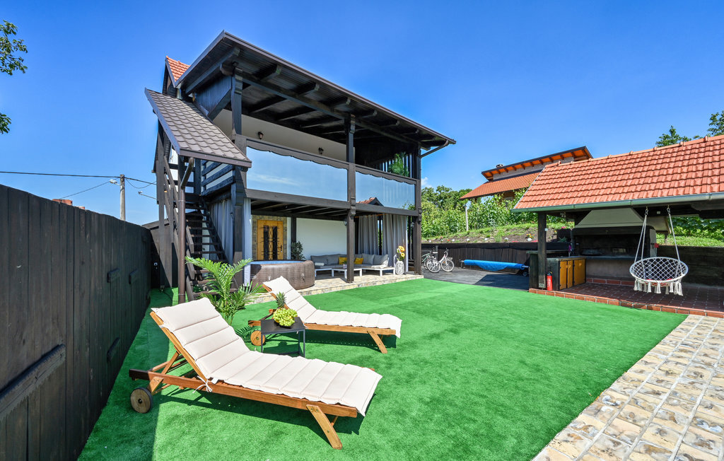Bien-être à l'extérieur : Location de vacances disposant de chaises-longues et d'un ou plusieurs équipements tels que piscine extérieure, jacuzzi extérieur, lit à baldaquin de jardin etc...