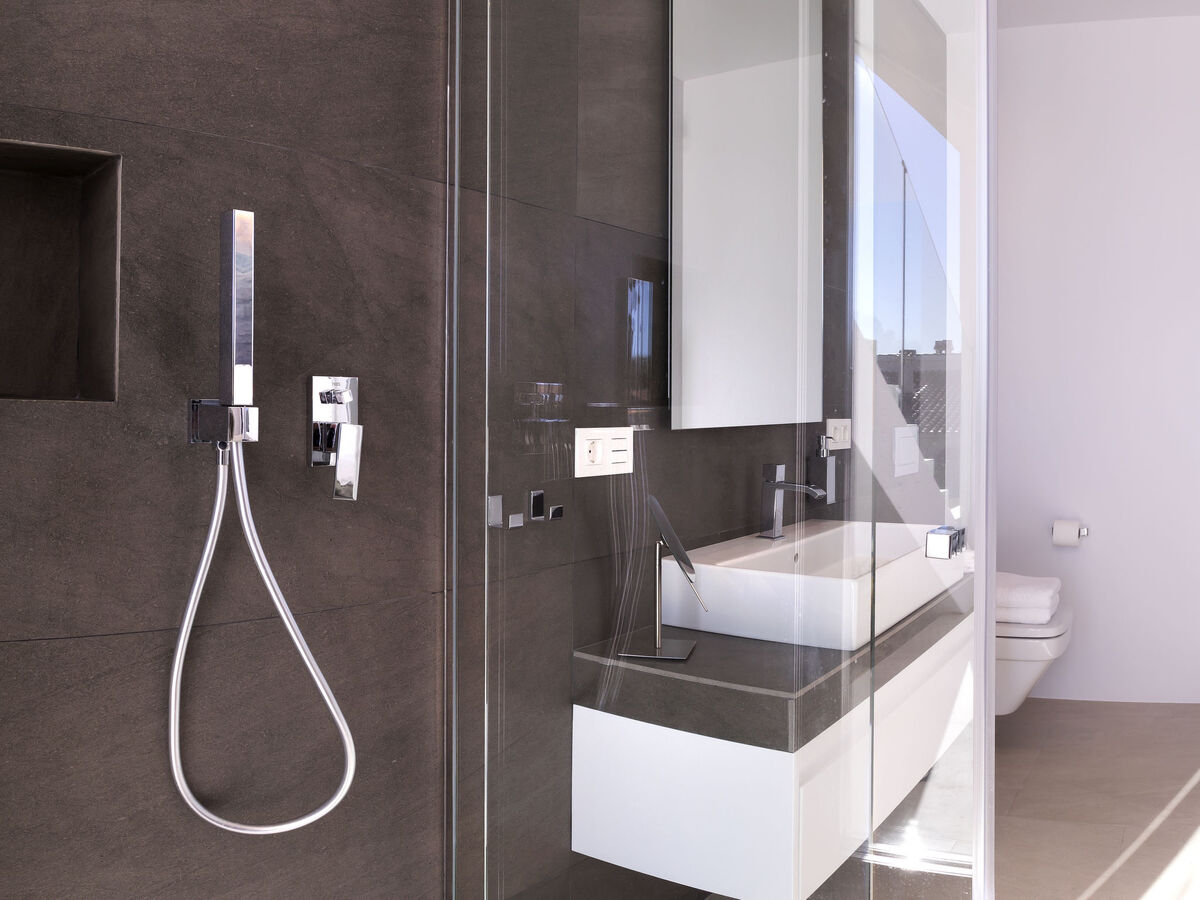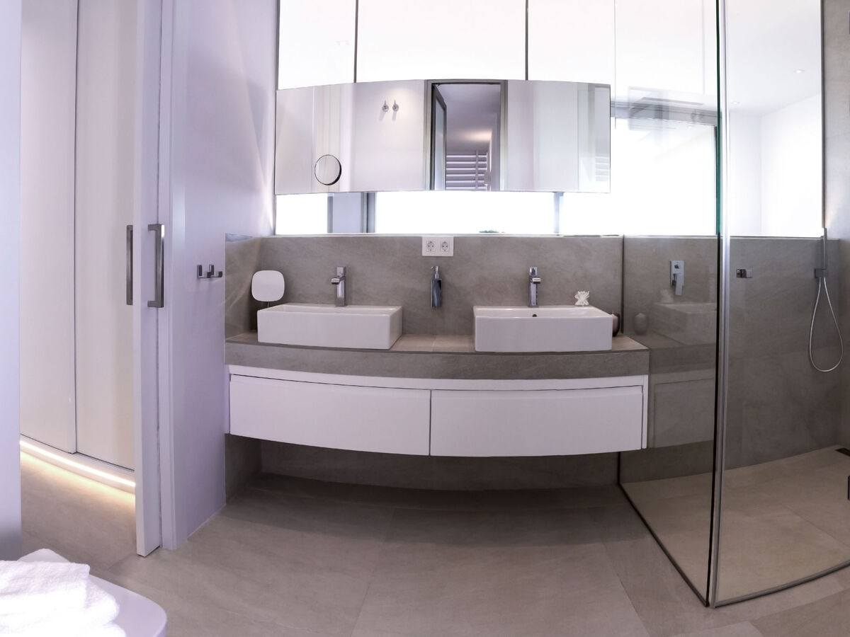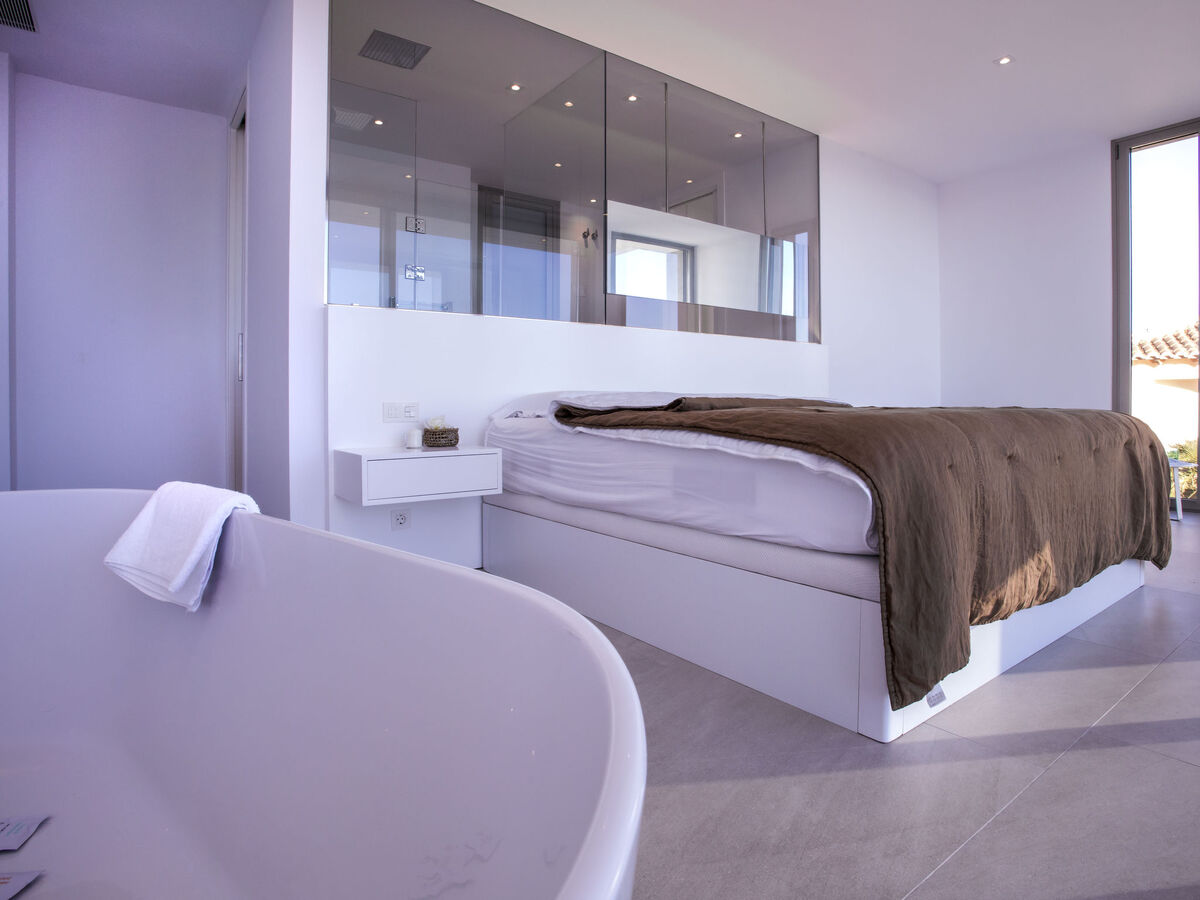 1 chambre avec 1 grand-lit (200 cm, longueur 200 cm), salle de bains, douche/WC, double vasque, air-conditionné et chauffage à air chaud.